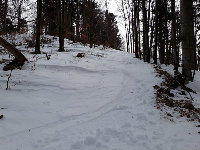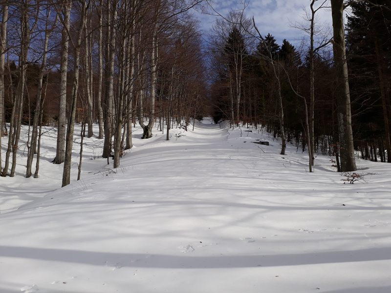 Discesa lungo la cresta in direzione ovest su neve sciabile compattata dal vento. Ultimo tratto seguendo la pista da sci che riporta a Lokve.