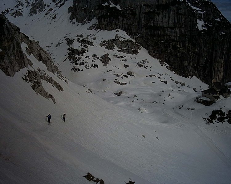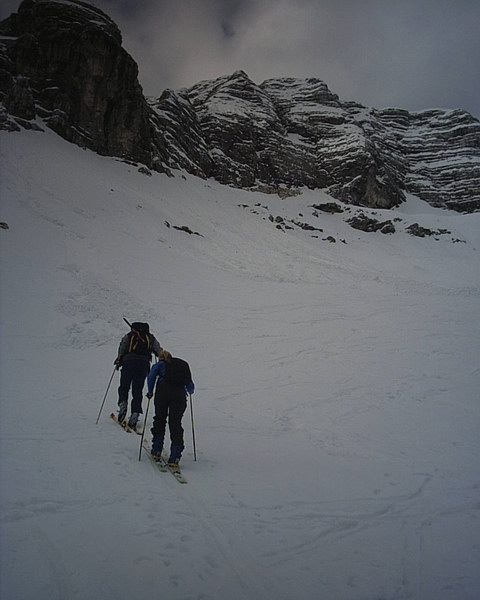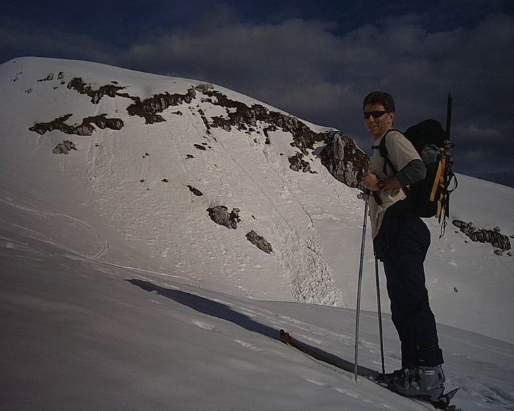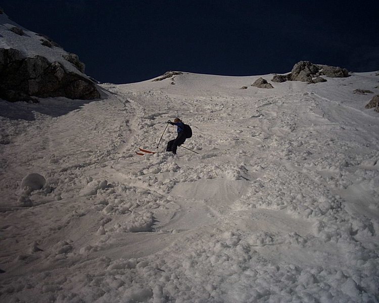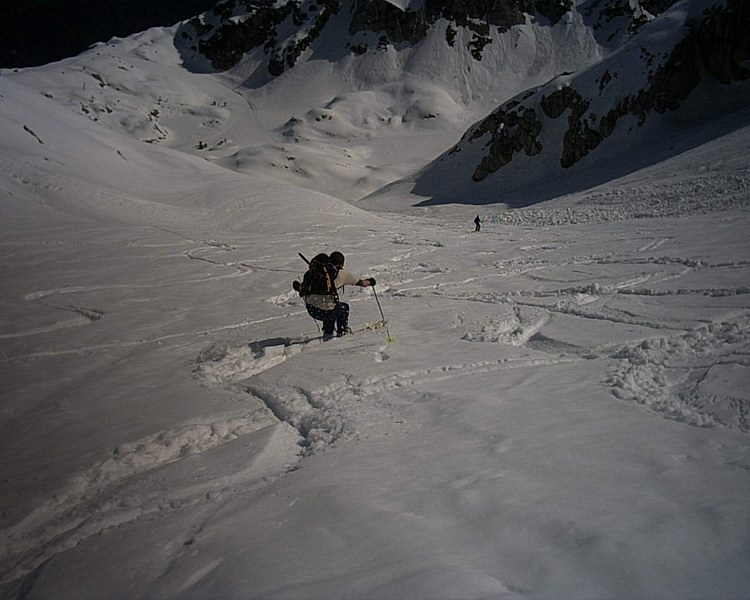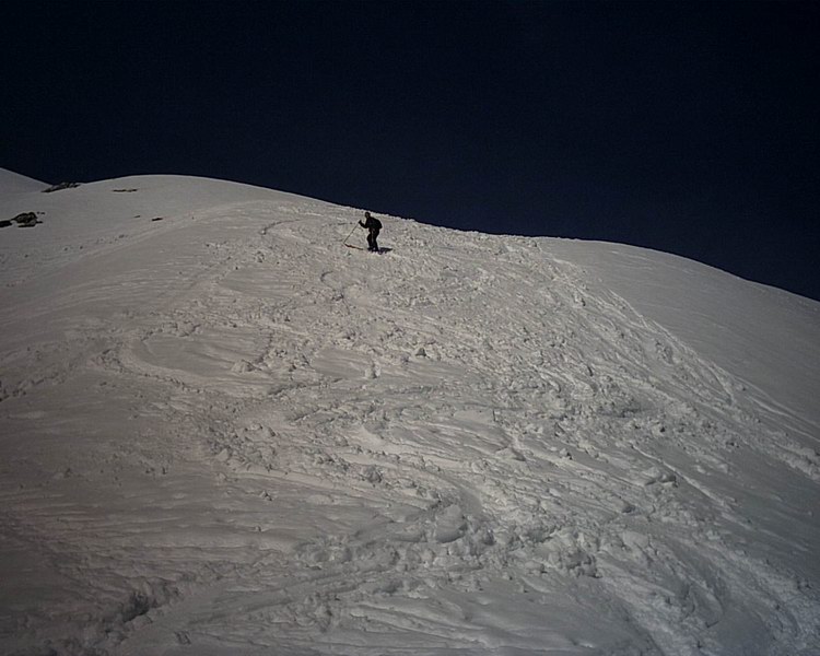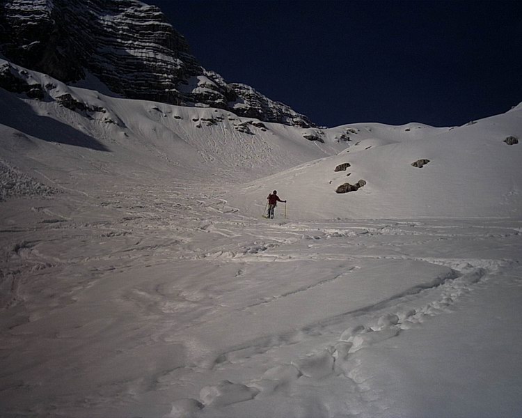 Salita tranquilla lungo la pista fino al rif. Gilberti (1850). Un breve taglio ci porta nel vallone che sale fino alla sella Ursic (2280). Sono le 9.30 e fa molto caldo. Dai pendii più ripidi ci sono dei piccoli distacchi spontanei. Per fortuna la meta è già raggiunta.