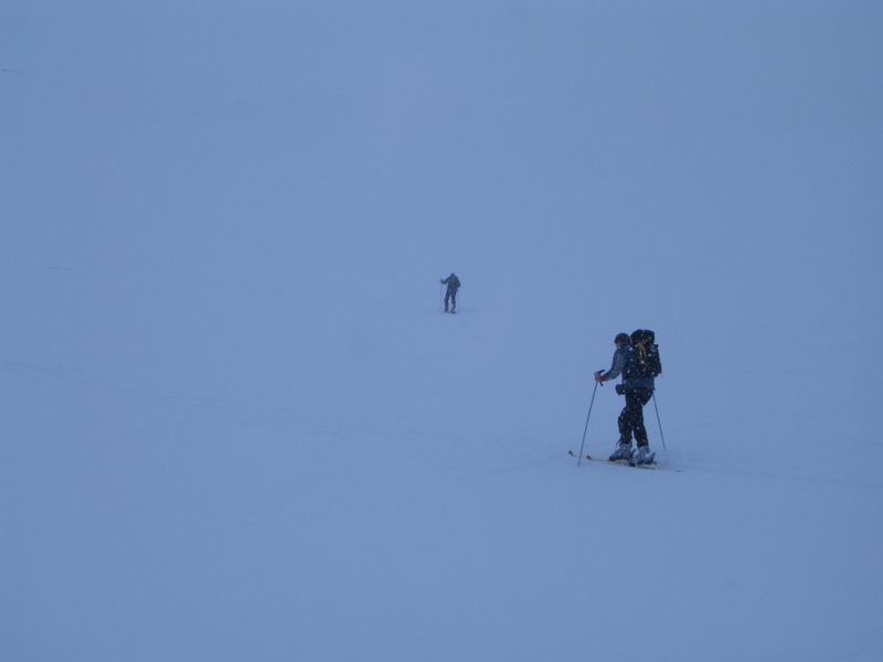 Senza ripercorrere la cresta scendiamo diretti verso est dal pointe du mottet. Nella prima parte, quella più ripida, siamo fortunati e la nebbia si alza. La neve è polverosa.