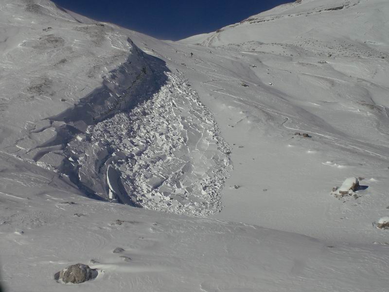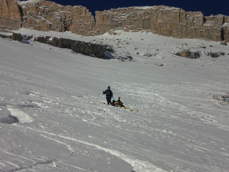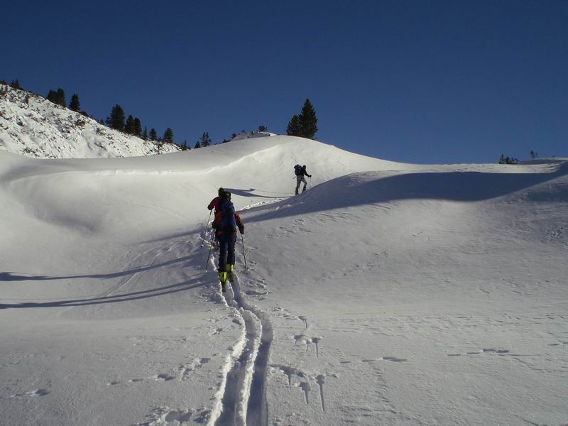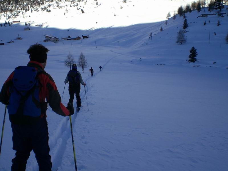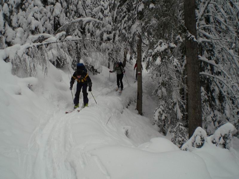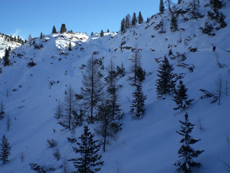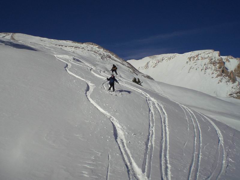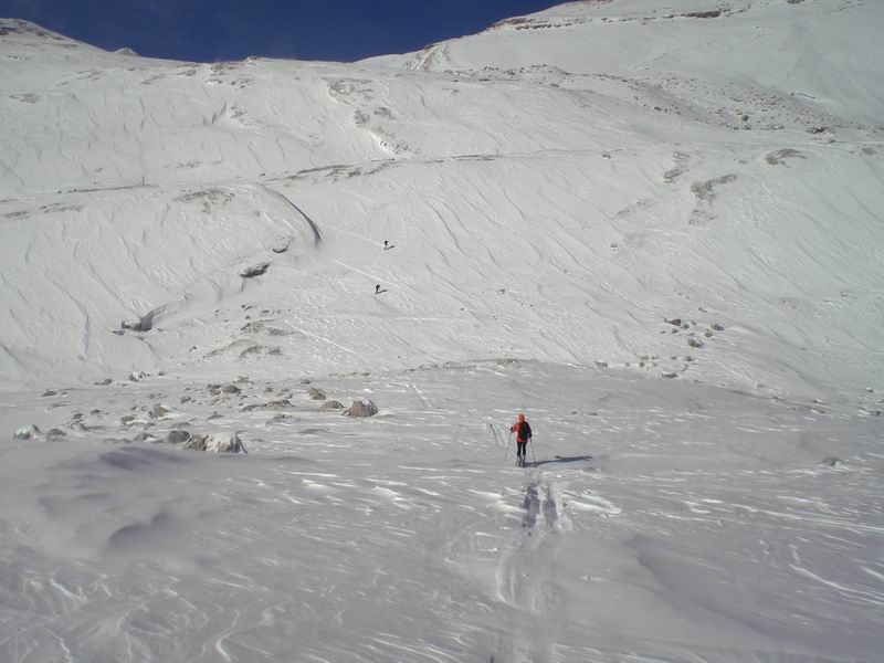 Via le pelli e torniamo a casa. La discesa è divertente solo per brevi tratti. Per la maggior parte si ripete il saliscendi dell'andata, bellissimo dal punto di vista ambientale, ma una palla da quello sciistico. Girandoci indietro vediamo i 3 "arditi" che scendono cautamente lungo il pendio provocando un gran scarico a pochi metri dalle loro scie.