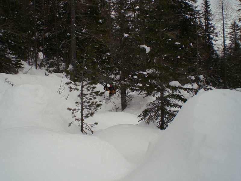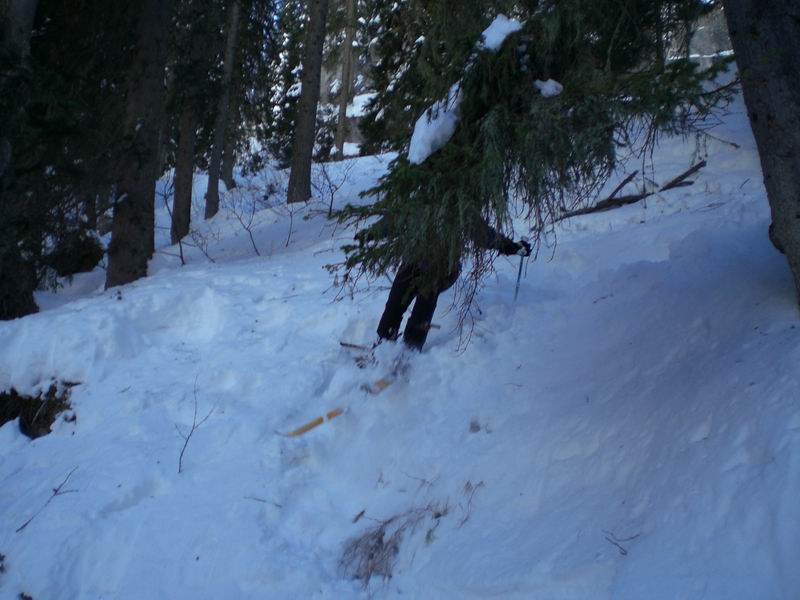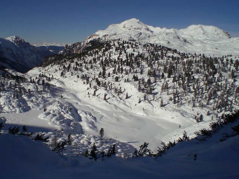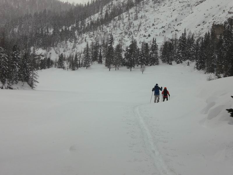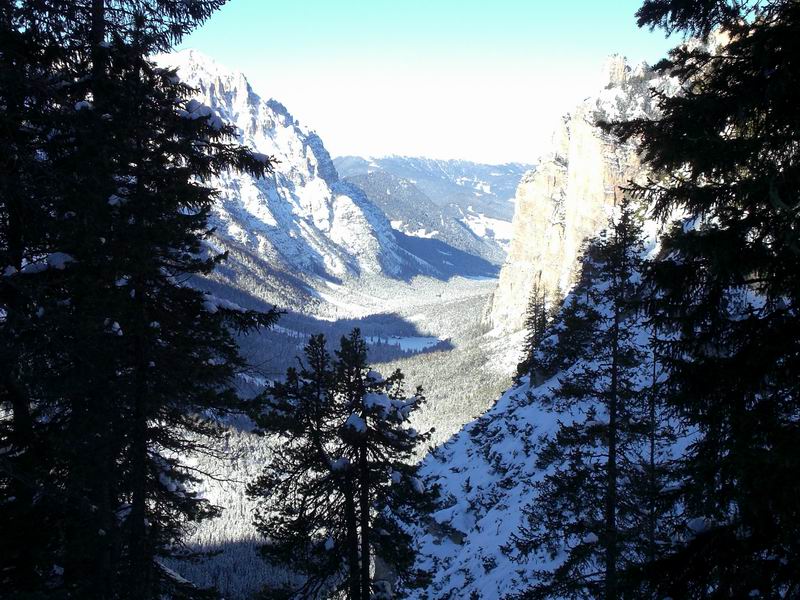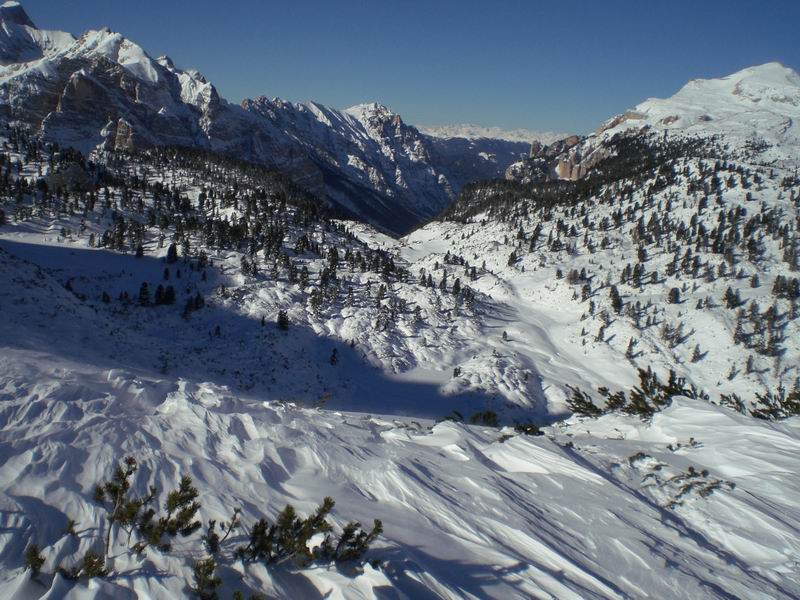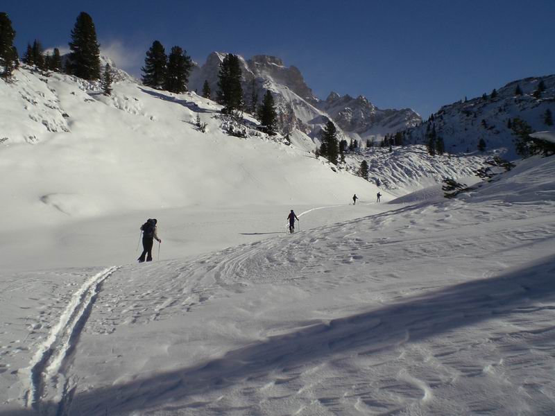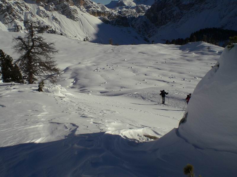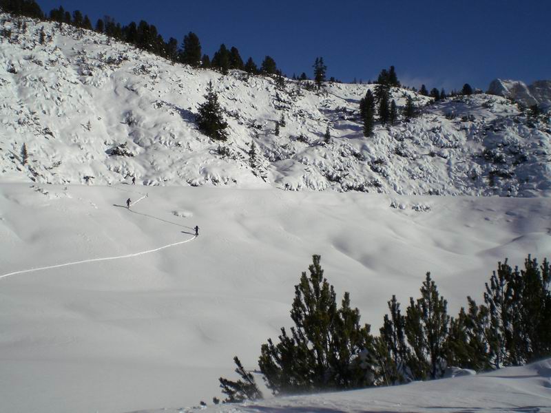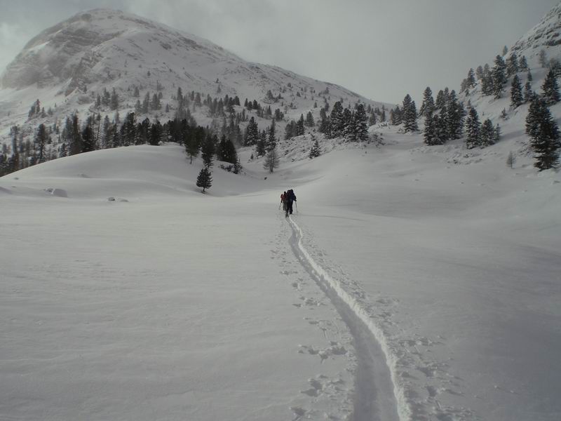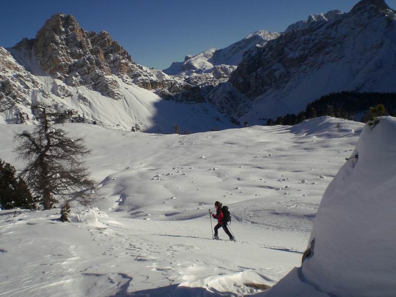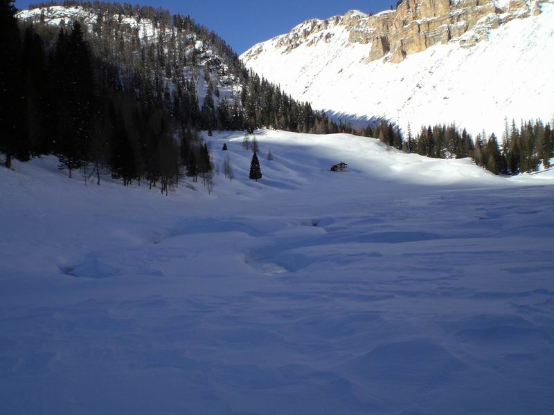 Si attraversa il ponte Outo sul rio Travenanzes e si prosegue verso ovest nella lunghissima val di Fanes. A quota 1750 passiamo un ponte sul rio fanes e ci allontaniamo dal pendino della furcia rossa. Entriamo nel bosco "dei boboli". Tra neve fresca, cocuzzoli e mughi sepolti vaghiamo 1/2 ora prima di uscire dal "labirinto". Poco prima del lago di Fanes ritroviamo una via più agevole..