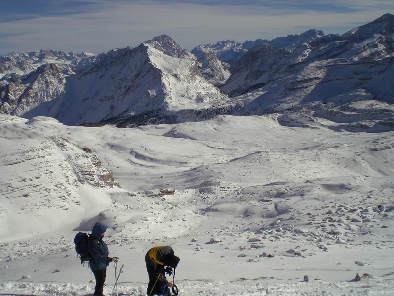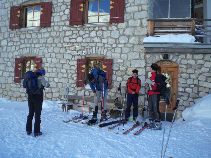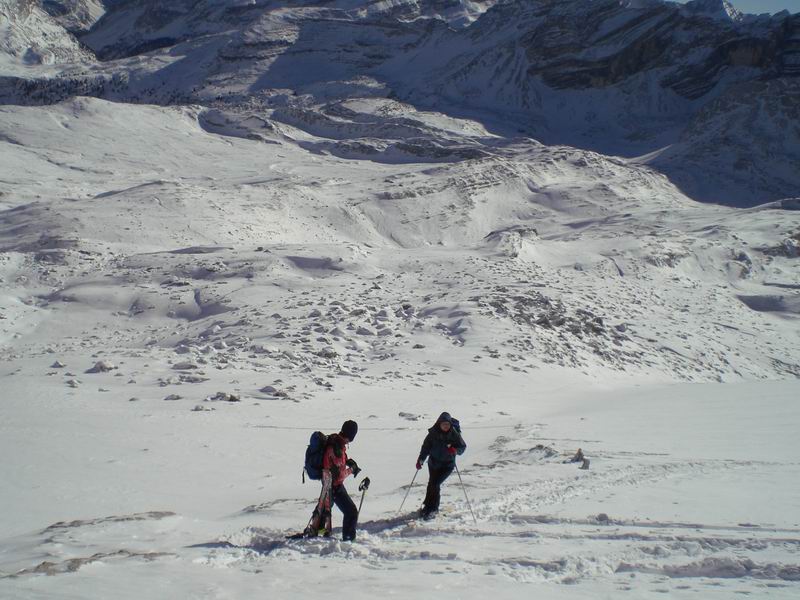 Saliamo al passo di Limo (2.174) dove finalmente togliamo le pelli e scendiamo al rifugio Fanes (2.060).