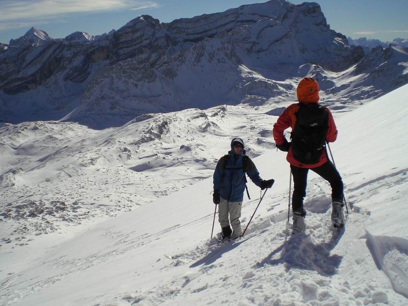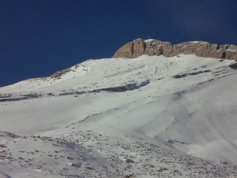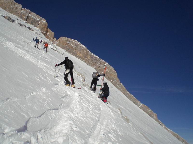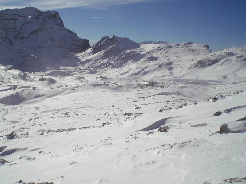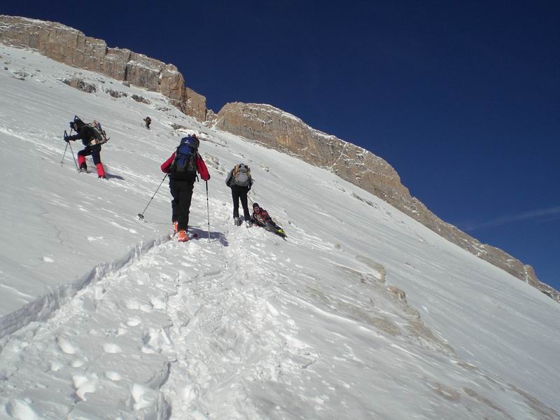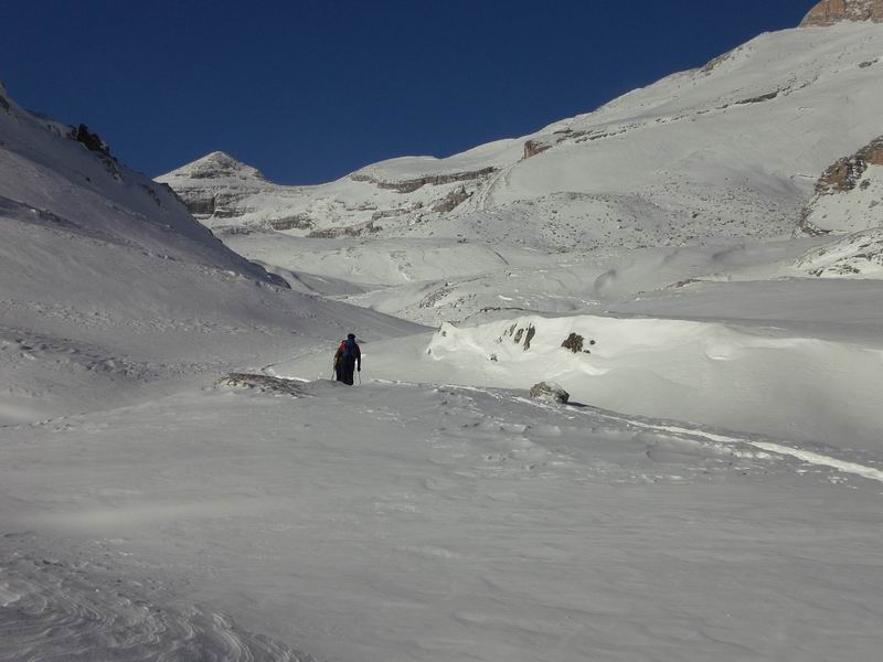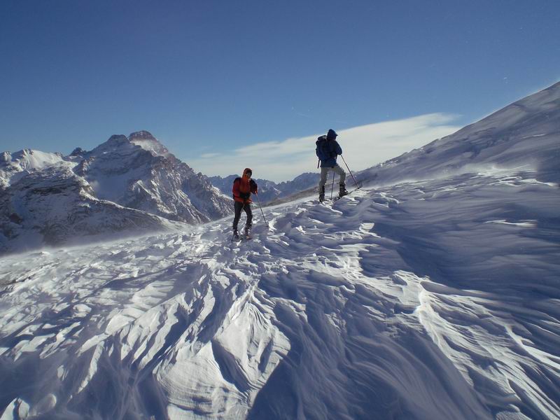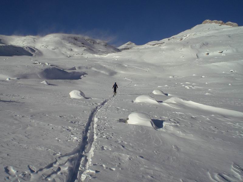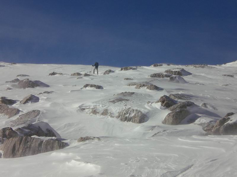 Si continua lungamente a batter traccia in almeno 40cm di neve fresca. Ogni tanto il vento si fa sentire con forti raffiche.