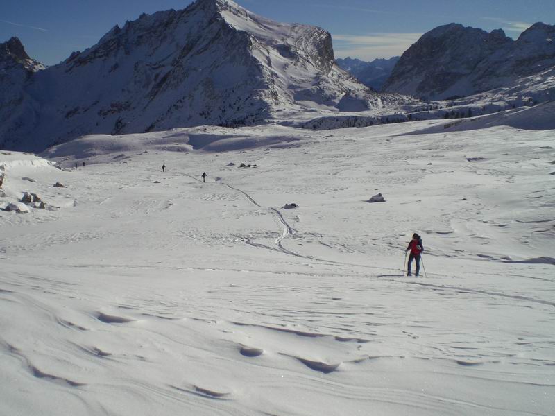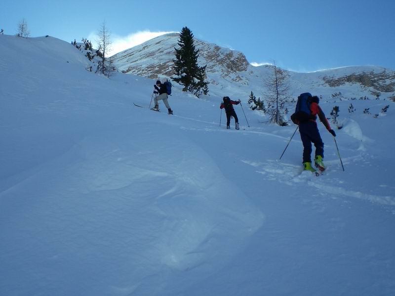 Da qui si ricomincia a batter traccia nella neve fresca. E' Luca che si prende la briga di aprire la strada a tutti fino al lago di Fodara e poi verso sud salendo al Lavinores.
