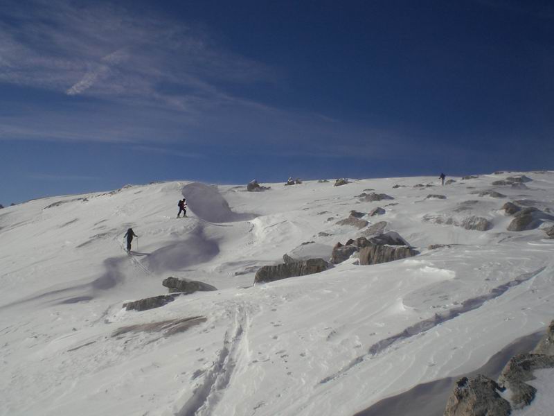Cominciamo la salita al sasso delle 10 con uno stretto zig zag su una dorsale rocciosa. Ad un certo punto vediamo che il vento ha lavorato troppo. Manca il fondo per poter curvare in discesa e tutta la neve si è accumulata sul pendio ad ovest. Sciarci sopra sarebbe un po' azzardato. Anche gli altri gitanti trovati lungo il percorso decidono per il retrofront. Solo 3 "arditi" continuano a salire.