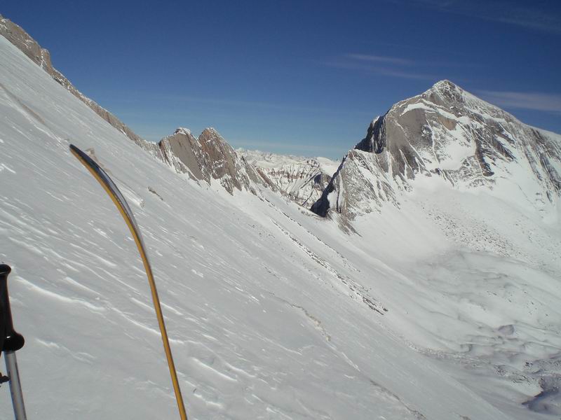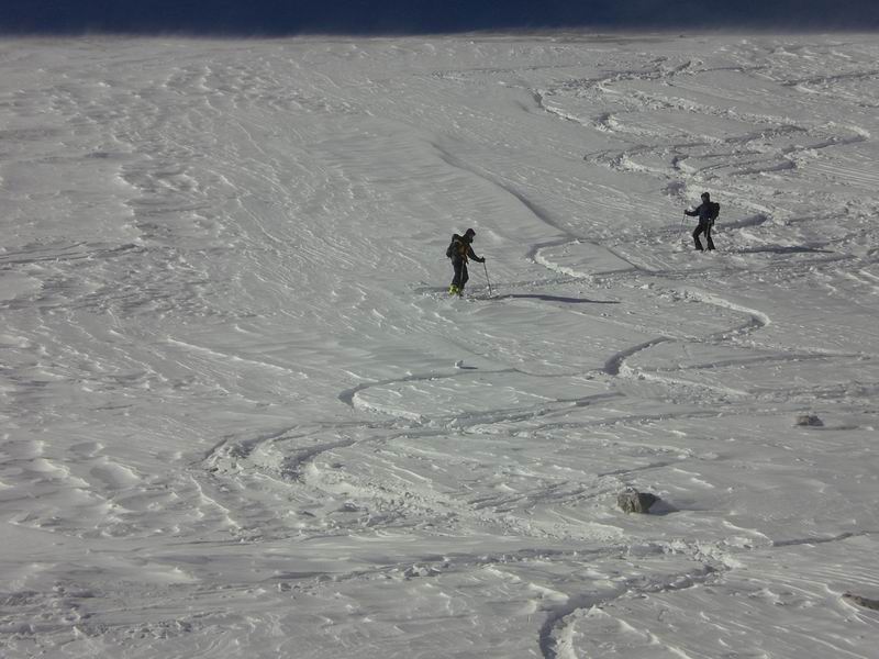 Arriviamo in forcella con vento urlante. Giusto il tempo di togliere le pelli ed ondeggiamo sul traverso ventato.