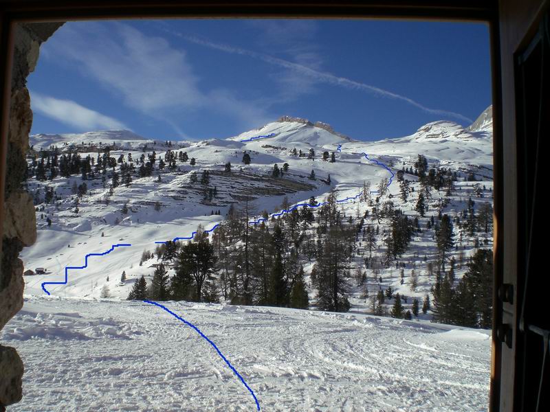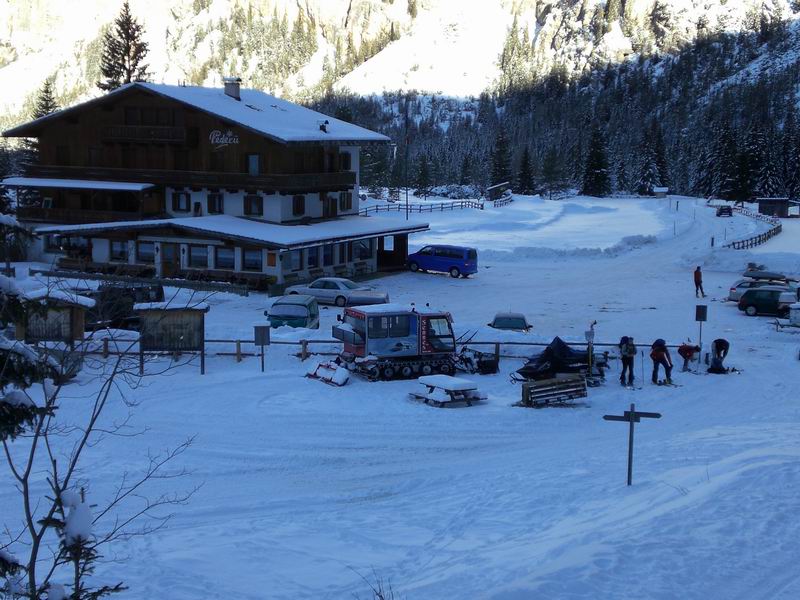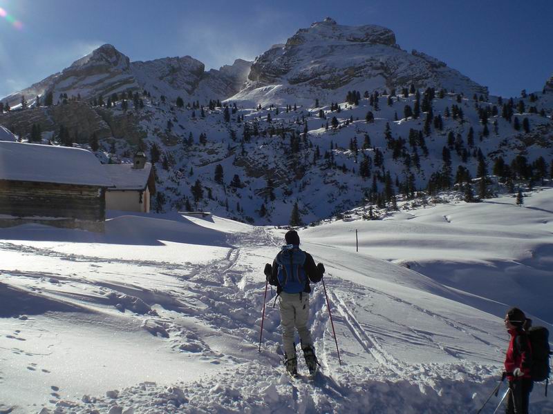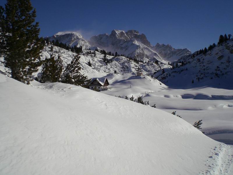 Dal rifugio Pederù (1.548) si mettono le pelli e si sale di 200m con ripidi tornanti a picco sulla valle di rudo. Poi più comodamente si raggiunge il rifugio Fodara Vedla (1.966).