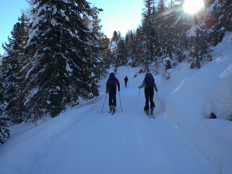 Scendiamo al campo croce e poi nel vallon scuro dove inizia una strada piatta. Un po' pattinando, un po' spingendo, passiamo il rifugio Ra Stua e ci smazziamo tutta la stradina piatta (salvo qualche breve tratto pendente) fino alle auto lasciate al tornantone di S.Uberto.