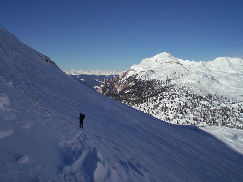 E qui arriva la discesa pregustata durante la salita. Dalla forcelletta al lago de Fodara sono 200m di puro divertimento. Il vento si calma ed è uno spasso galleggiare nella polvere.