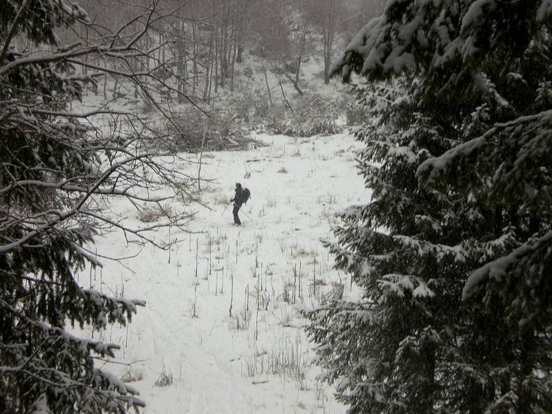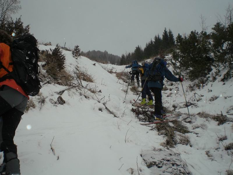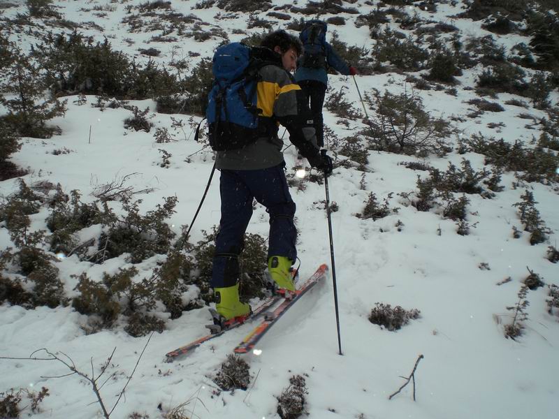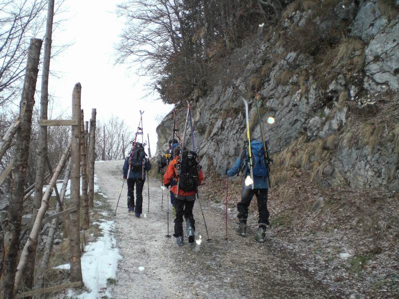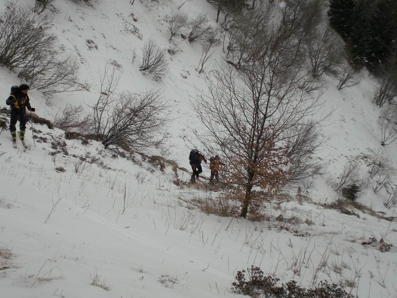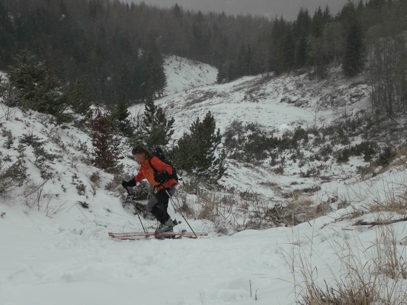 Primi 5 minuti a piedi con gli sci in spalla. Poca neve ed i primi 100 metri si fanno passando su arbusti, sassi e rami che riempiono il valloncino.