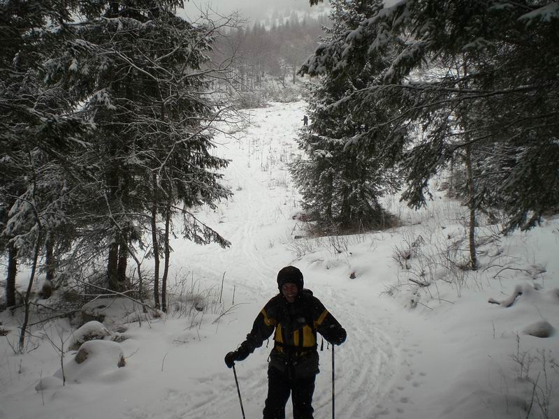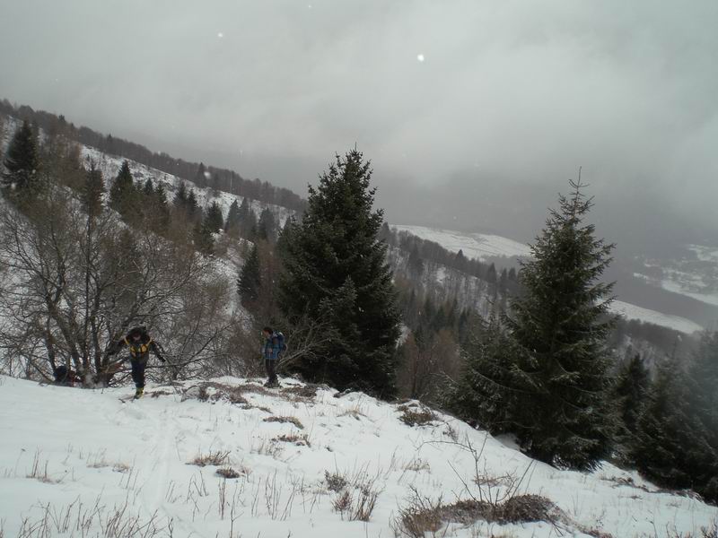 Meteo: abbondante nevicata fin dalla partenza. Un po' di vento fuori dal bosco, nebbia in cima.