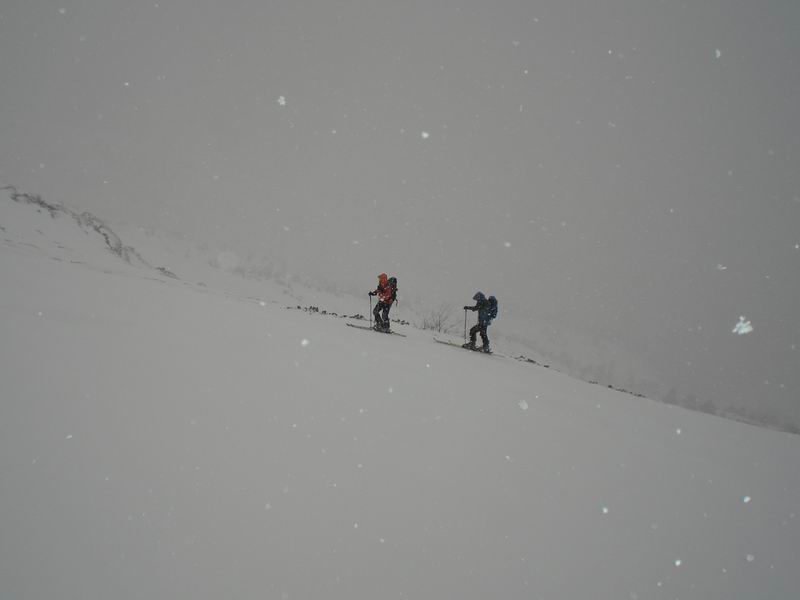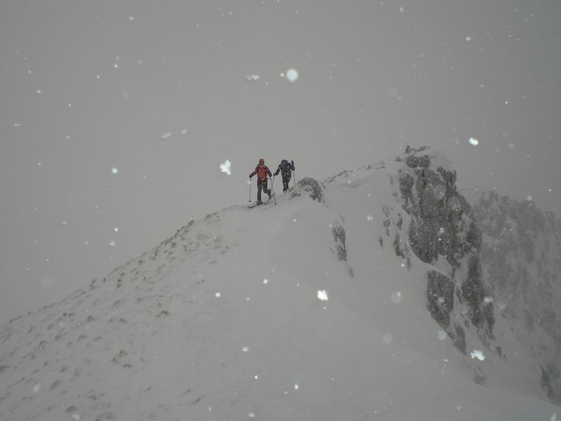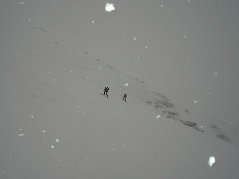 Viste le cornici, la pendenza e la nevicata per prudenza siamo saliti a debita distanza uno dall'altro.