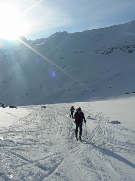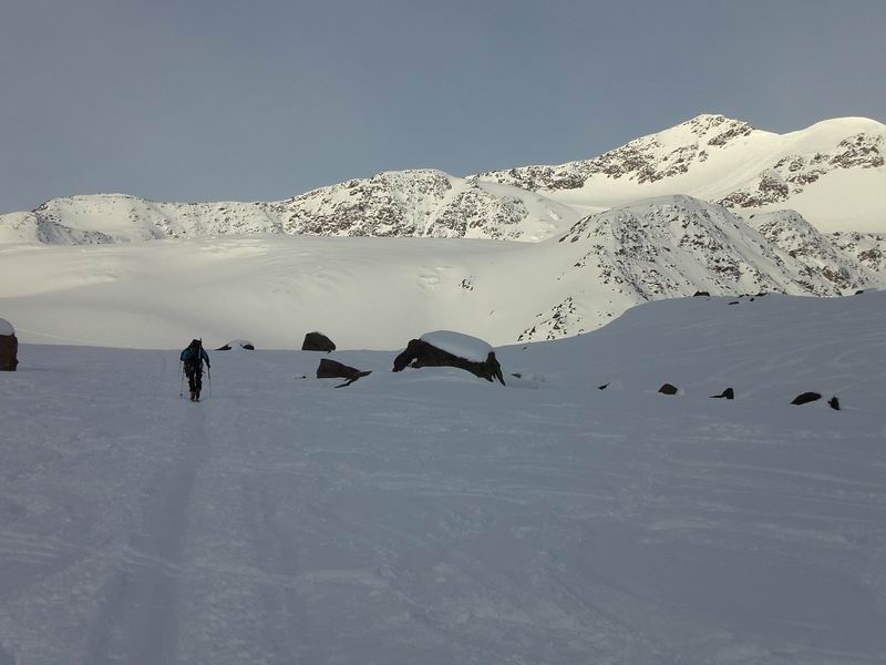 In 1/2 ora si risale verso sud l'ampio vallone della Forcola. Quindi puntiamo ad ovest dove inizia la lunga attraversata della Vedretta del Cevedale (Zufallferner). Pendenza molto modesta e la traccia va via lunga e diritta. Sulla sinistra sale imponente la cima Cevedale che aggiriamo pazientemente. Solo dopo 2h e mezza pieghiamo verso sud e scorgiamo poco più in basso il rifugio Corsi.