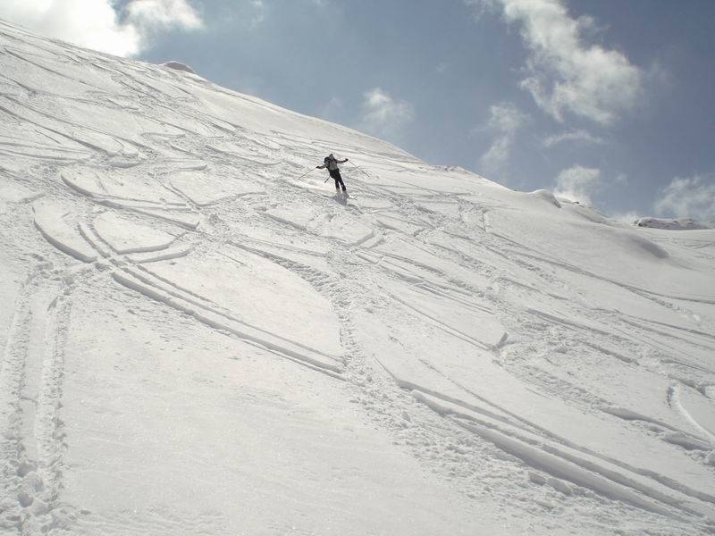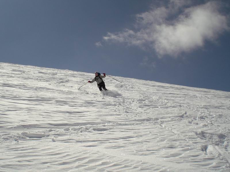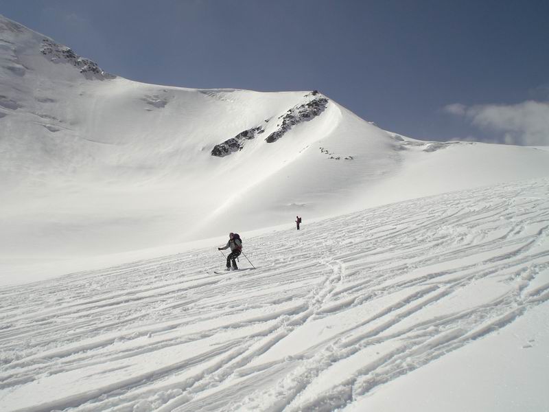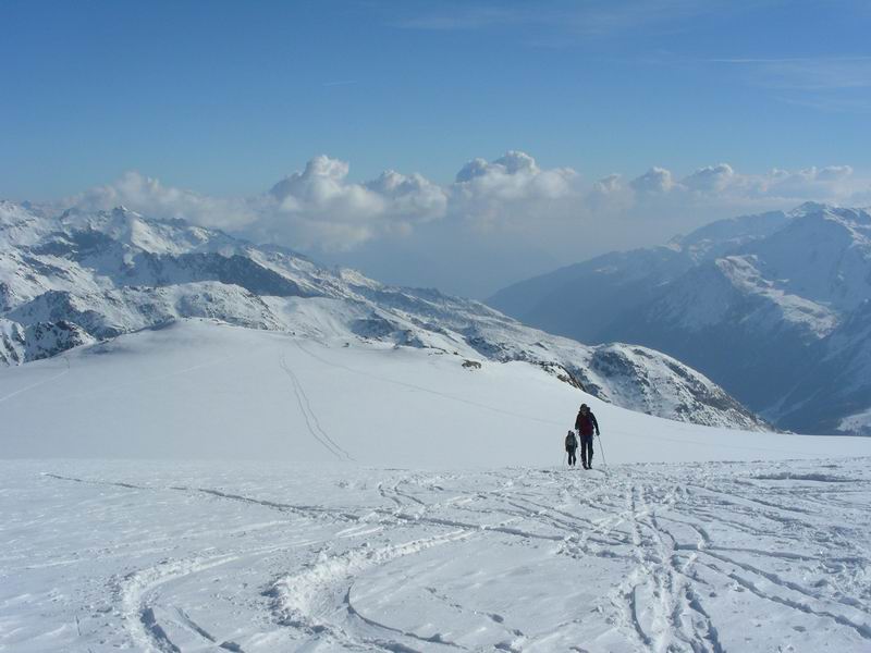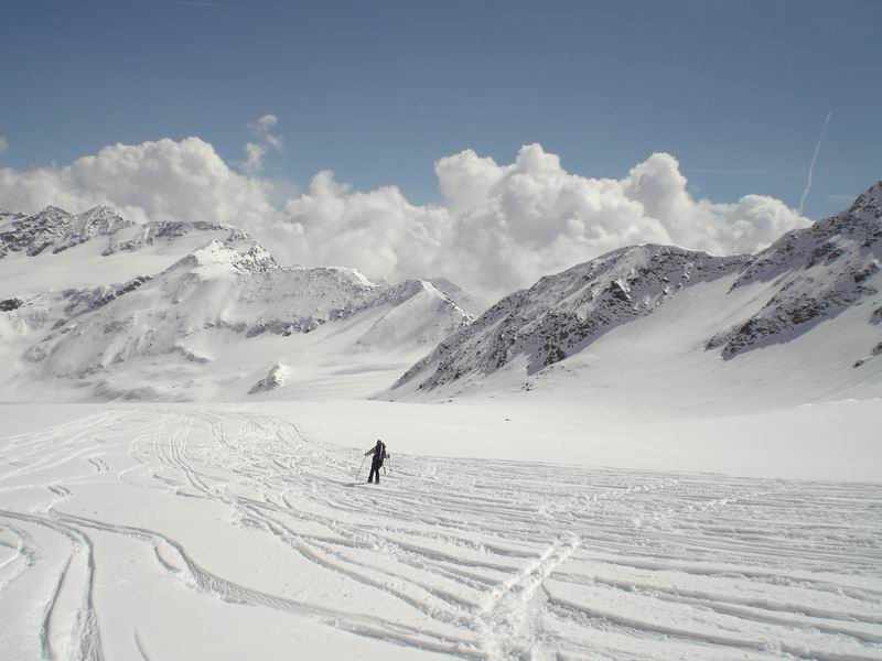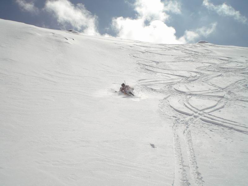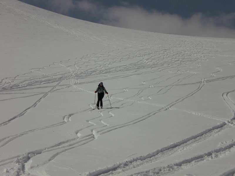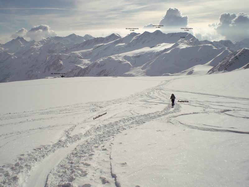 Ancora bella neve per tutta la lunga vedretta del Cevedale. Poi la neve si fa più crostosa e tagliamo sotto la Fuerkeleferner per appoggiarci ai pendii esposti NW sotto la vedretta Alta. E nuovamente polvere..... e ancora divertimento. Matteo si lancia in spettacolari evoluzioni stile "triplo tolup" immortalate solo nella parte finale da uno scatto della digitale.