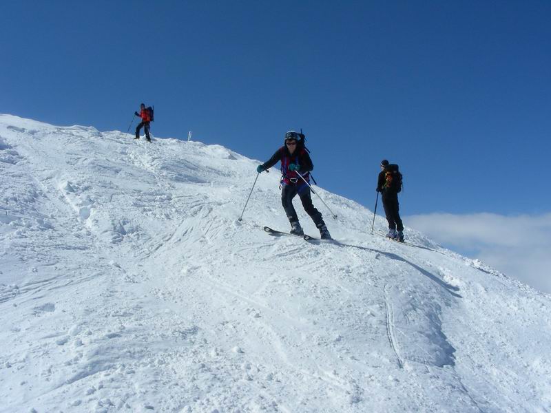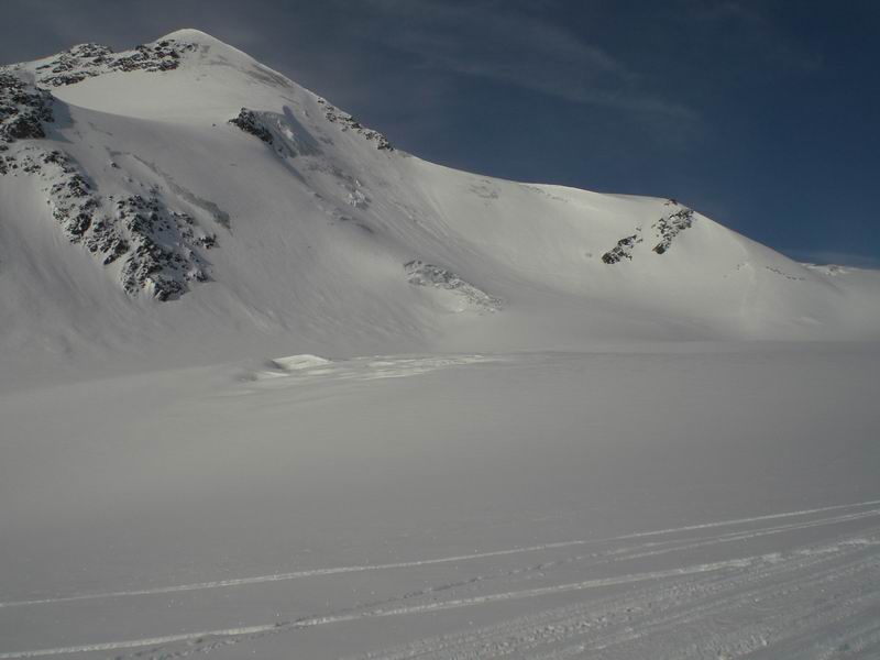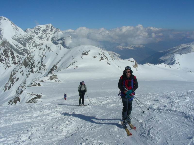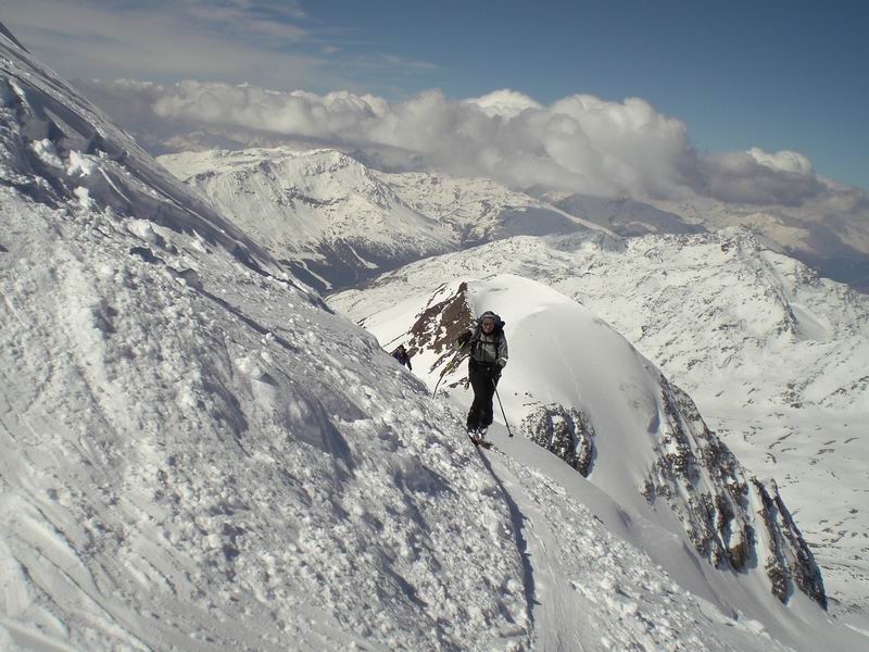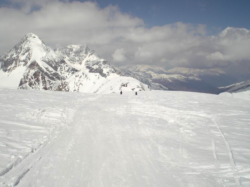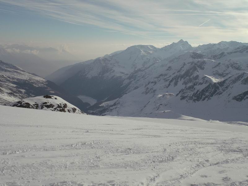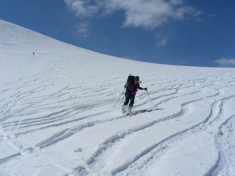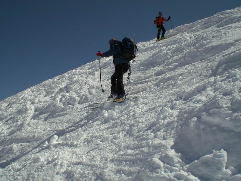 Ancora bella neve per tutta la lunga vedretta del Cevedale. Poi la neve si fa più crostosa e tagliamo sotto la Fuerkeleferner per appoggiarci ai pendii esposti NW sotto la vedretta Alta. E nuovamente polvere..... e ancora divertimento. Matteo si lancia in spettacolari evoluzioni stile "triplo tolup" immortalate solo nella parte finale da uno scatto della digitale.