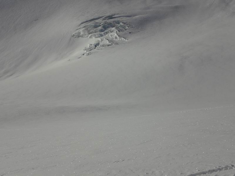 Ed il divertimento continua anche sul ghiacciaio. Polvere, polvere, polvere. Tagliamo verso nord puntando dritti alla cima "Tre cannoni" guadagnando un pezzo un po' più ripido per lanciarci in spettacolari serpentine. Su questa neve anche noi, comuni mortali, riusciamo a disegnare le "S" da copertina.... o almeno così vogliamo credere :-)