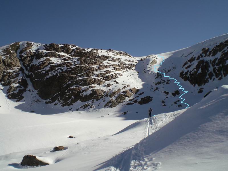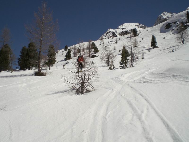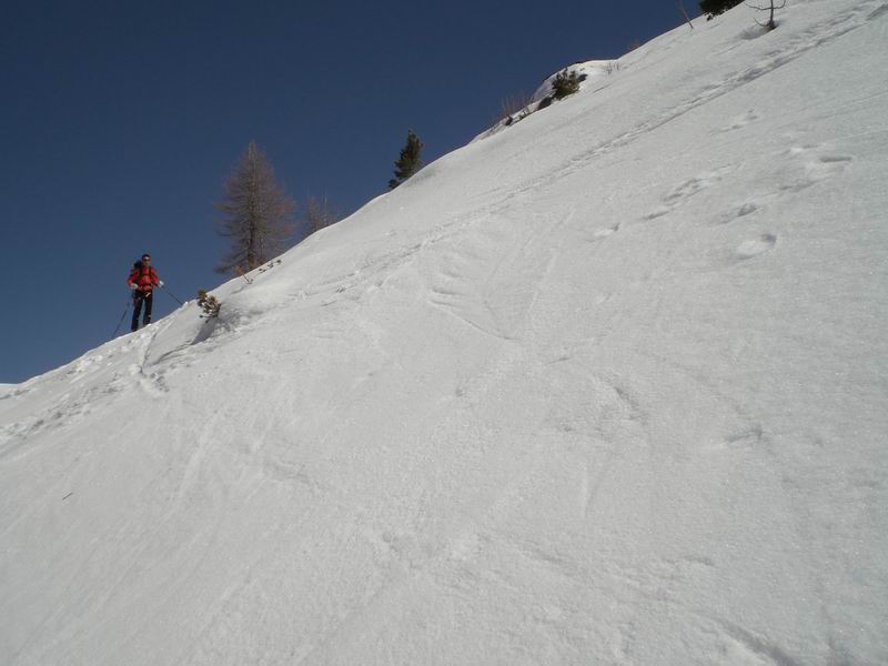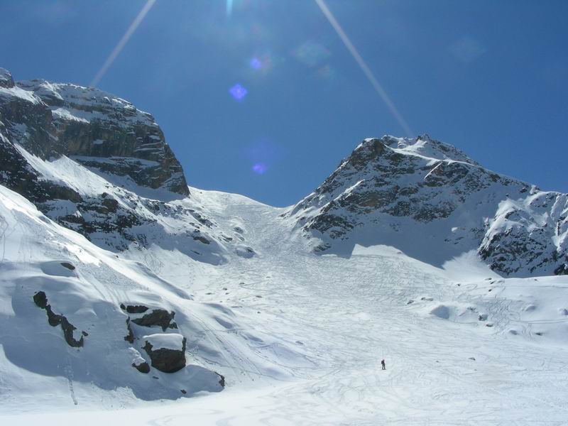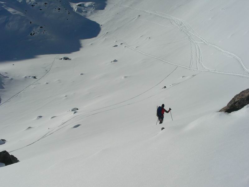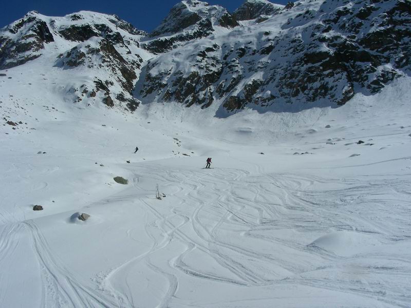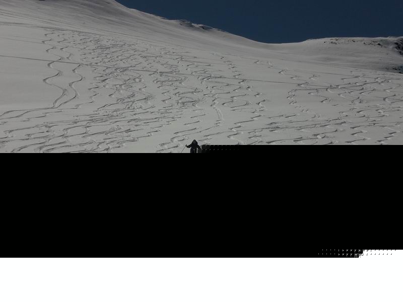 Neve: Polvere nella parte alta del ghiacciaio. Crostosa nella parte bassa del ghiacciaio. Nuovamente polvere nei canali a nord, firn portante nell'ultimo tratto e nel boschetto finale.