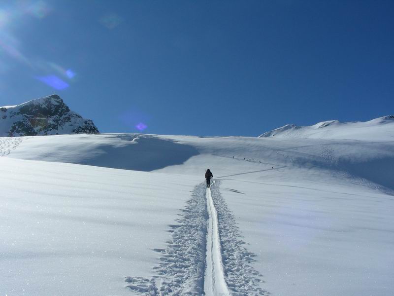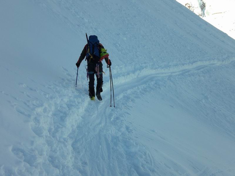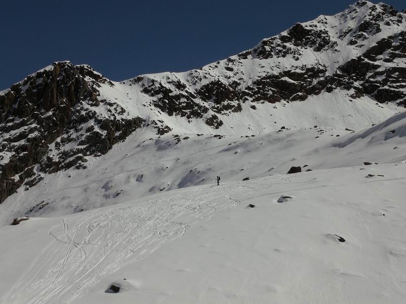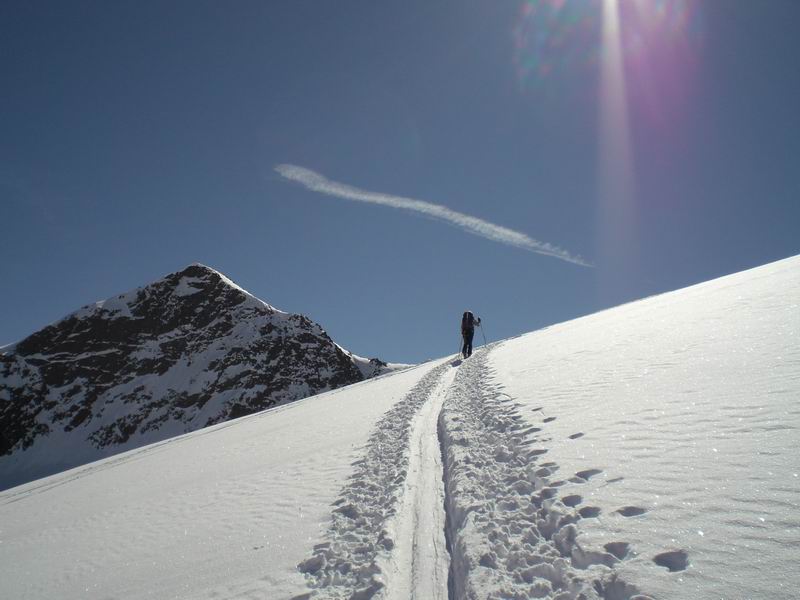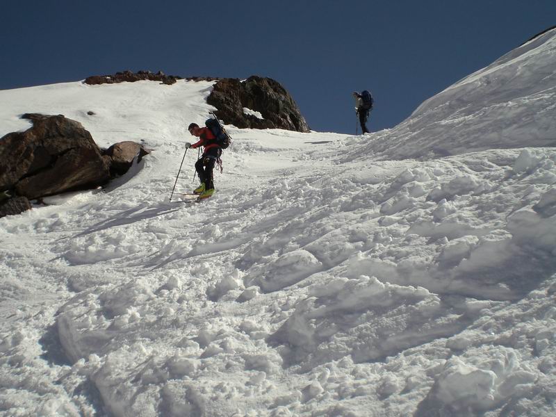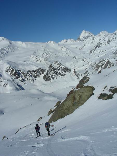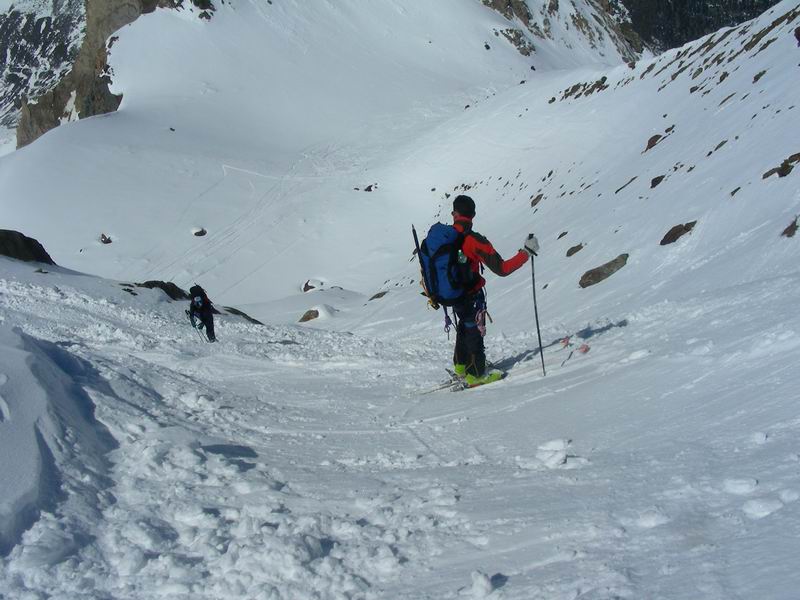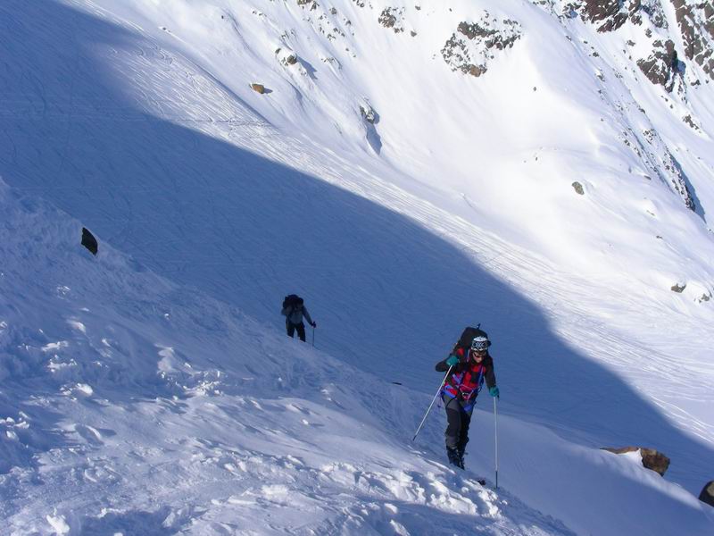 Passiamo sotto Punta la Cuna ed entriamo nel vallone basso a nord della vedretta Alta. Passiamo sotto alla Ultenmarktferner fino a quota 2.800. Quindi siamo costretti a pendolare con i rampant su neve dura per guadagnare la Vedretta Serana.