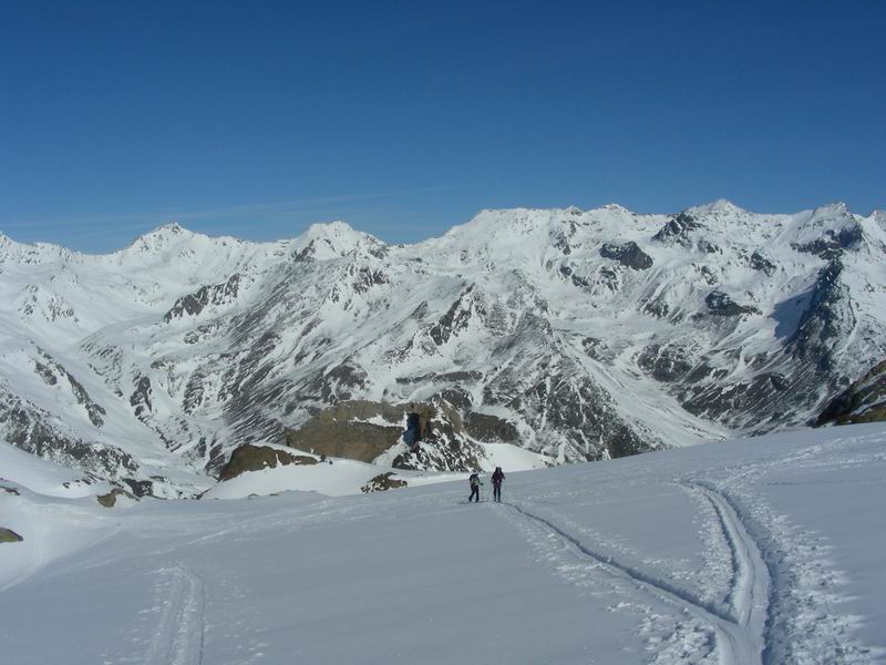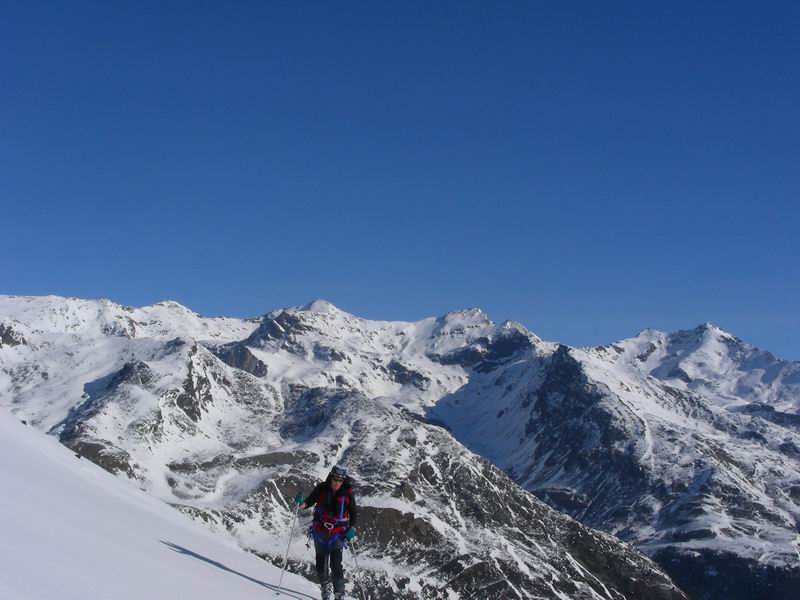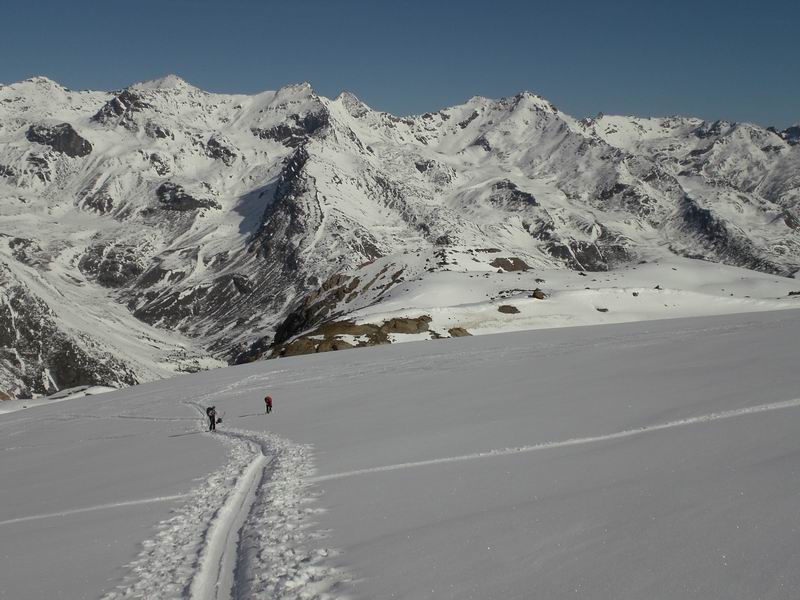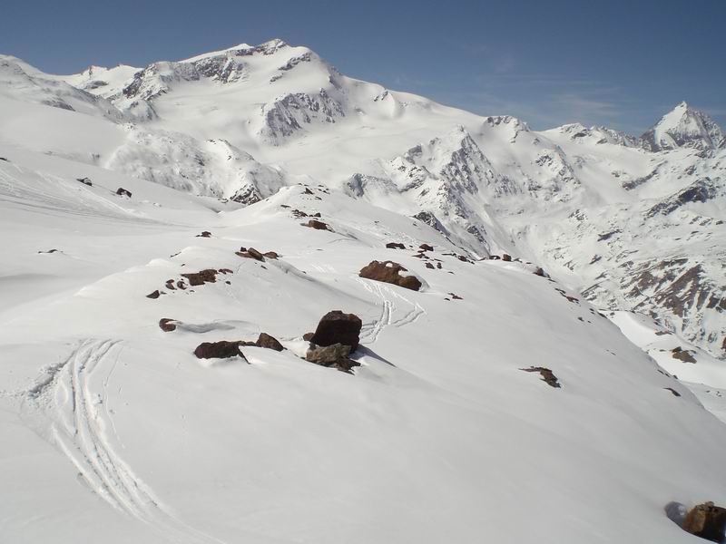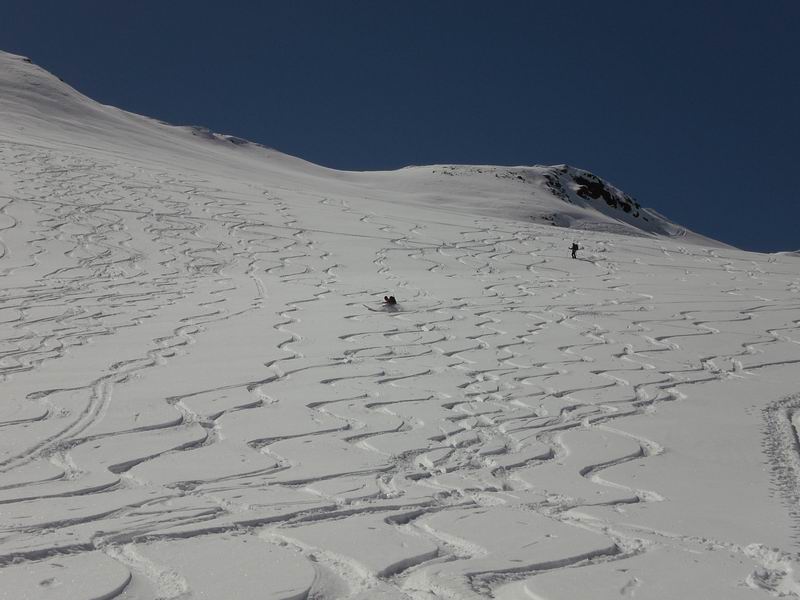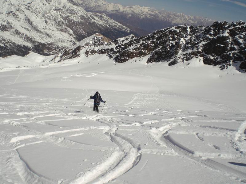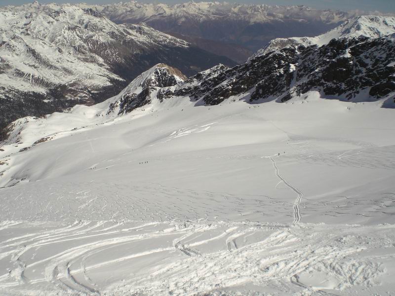 Il solo panorama è sufficiente ad appagare lo sforzo della salita.... ma la gita non è finita... ora c'è la lunga discesa fino all'auto... e le premesse buone ci sono tutte. Sole splendido, caldo, pendio ideale su ghiacciaio, già molte tracce ad evitare possibili crepacci e soprattutto una neve polverosa da favola.
