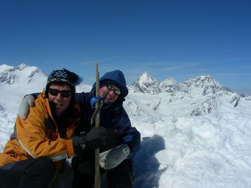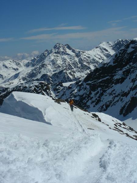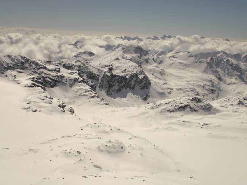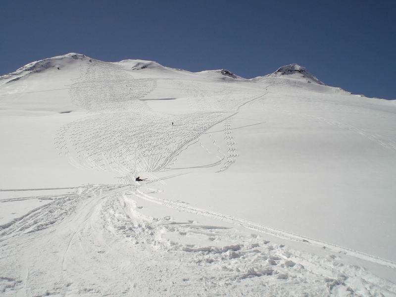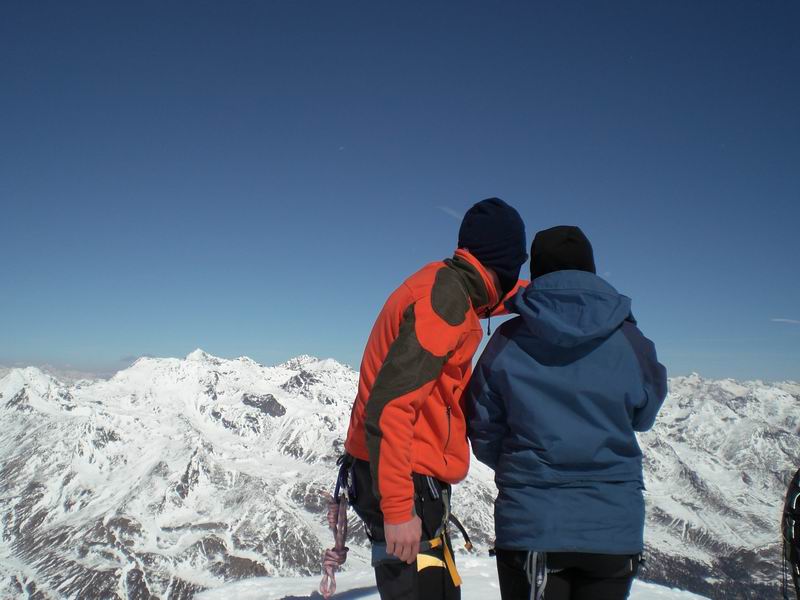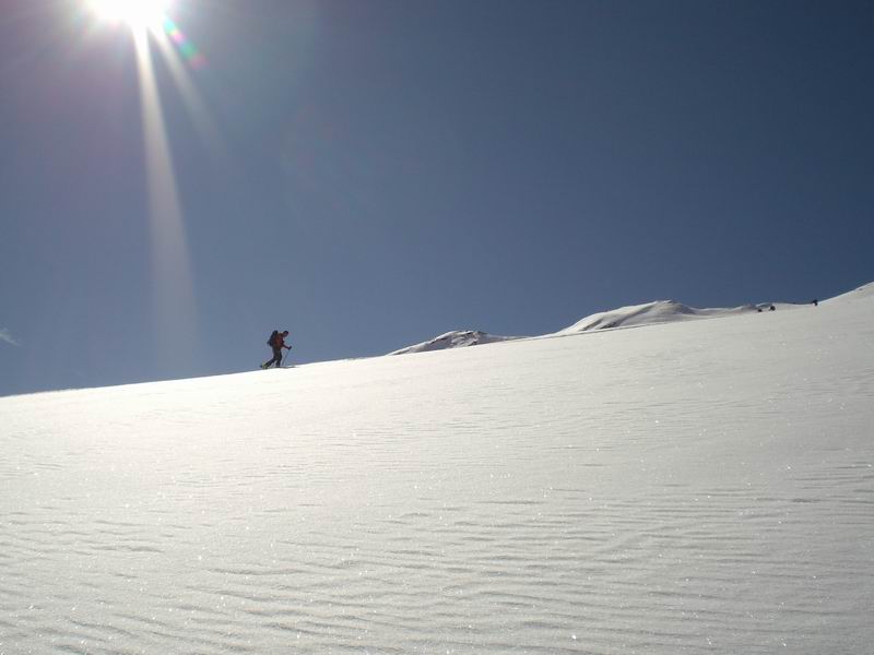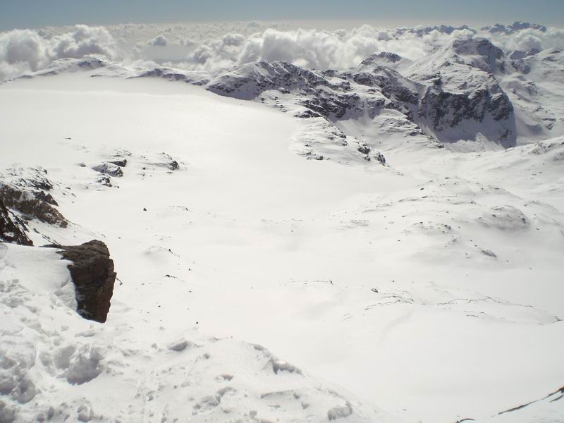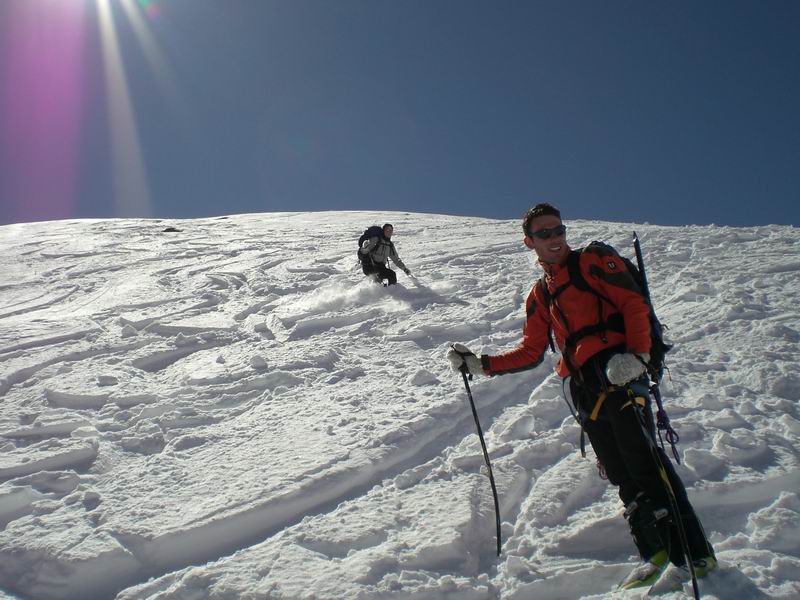 Il solo panorama è sufficiente ad appagare lo sforzo della salita.... ma la gita non è finita... ora c'è la lunga discesa fino all'auto... e le premesse buone ci sono tutte. Sole splendido, caldo, pendio ideale su ghiacciaio, già molte tracce ad evitare possibili crepacci e soprattutto una neve polverosa da favola.