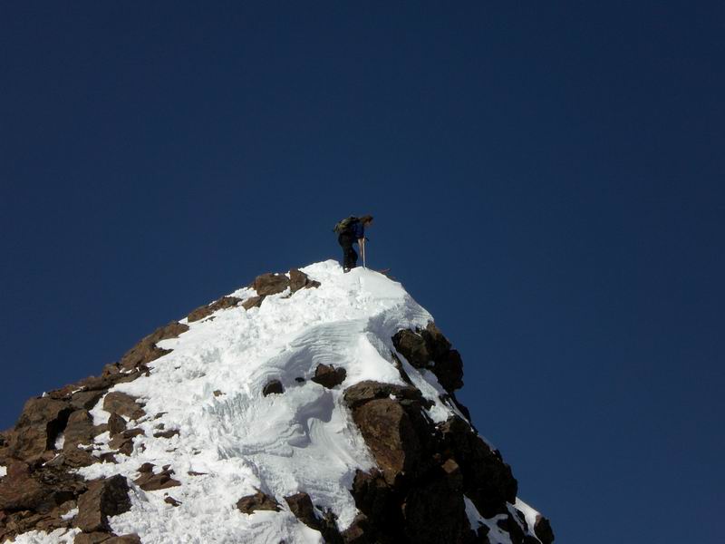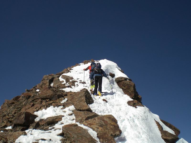 Federica e Matteo sono i primi a salire. Fox valuta dal basso e solo in seguito decide che si può salire.... e ne valeva la pena. Oltre all'ormai consueta vista sul parco dello Stelvio e sugli imponenti Gran Zebrù e Ortles, si apre, dalla cima, un panorama mozzafiato sulla sterminata Vedretta Careser. Un'immensa distesa bianca priva di qualsiasi traccia umana.