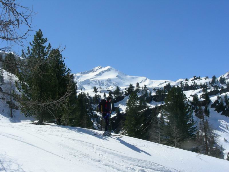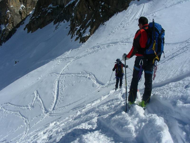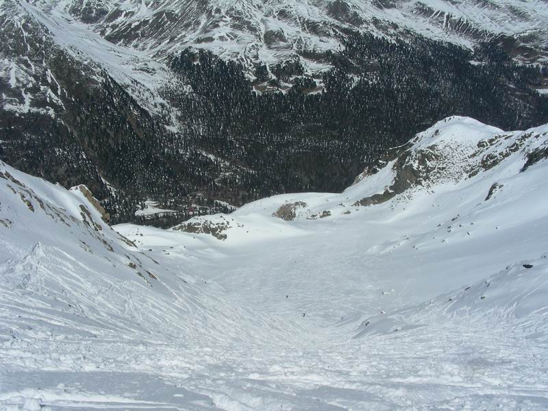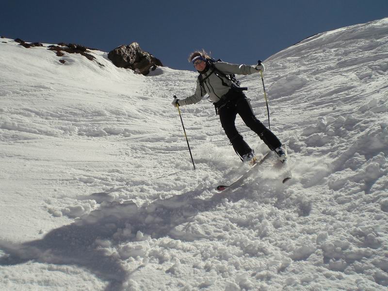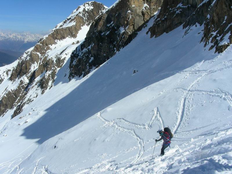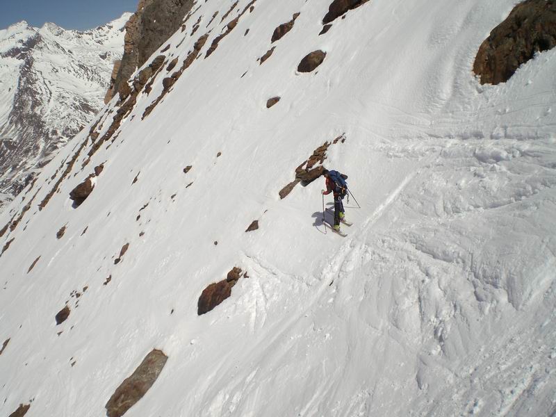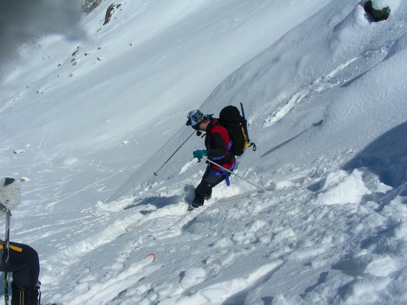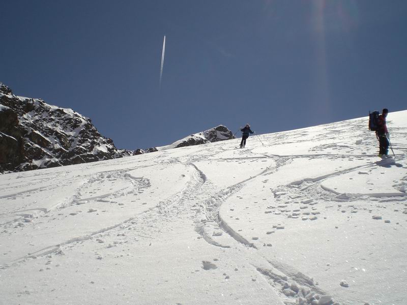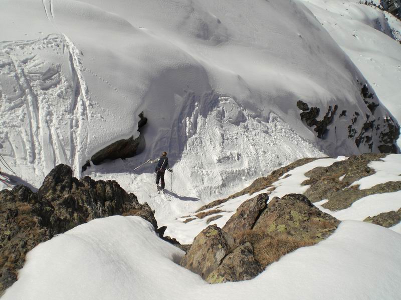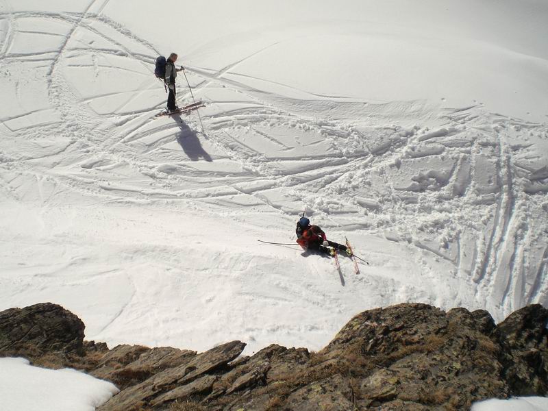 Sotto quota 3000 la neve si fa crostosa e alle "S" si sostituiscono le "Z". Lunghe e tattiche diagonali ci portano in prossimità della Schranzspitze dove iniziano i canaloni nord. E canale nord significa nuovamente pulverchnee. Un po' più pesante rispetto allo zucchero di quota 3.200 ma cmq da favola.