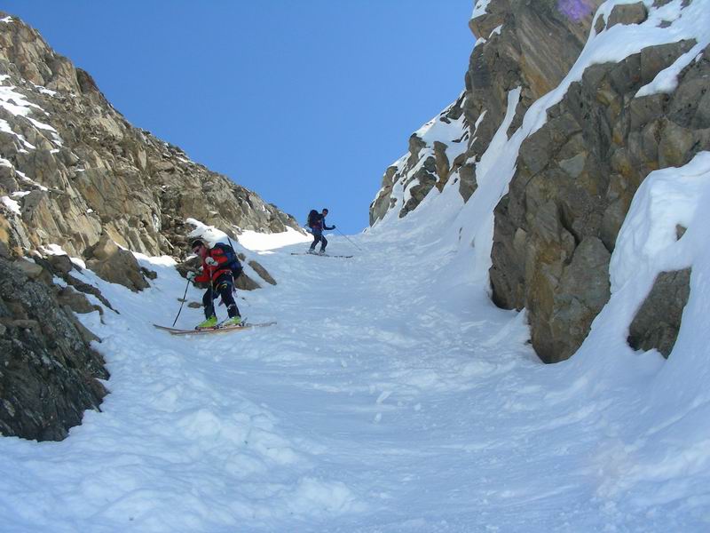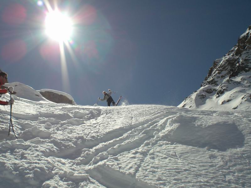 Saltiamo da un canalino all'altro in cerca della neve migliore. Ogni tanto usciamo dai canali e tiriamo qualche curva su firn. Ci va veramente di lusso!!
