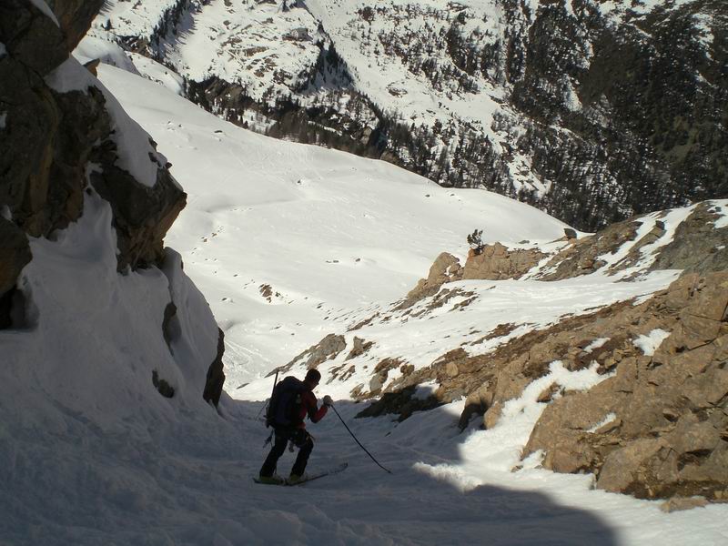 A quota 2.550 l'ennesima sorpresa positiva della giornata. Ci infiliamo in un canale stretto e pendente... roba da OSA. Matteo non batte ciglio. Federica saltella. Fox è entusiasta. Bellissimo, bellissimo, bellissimo!!!