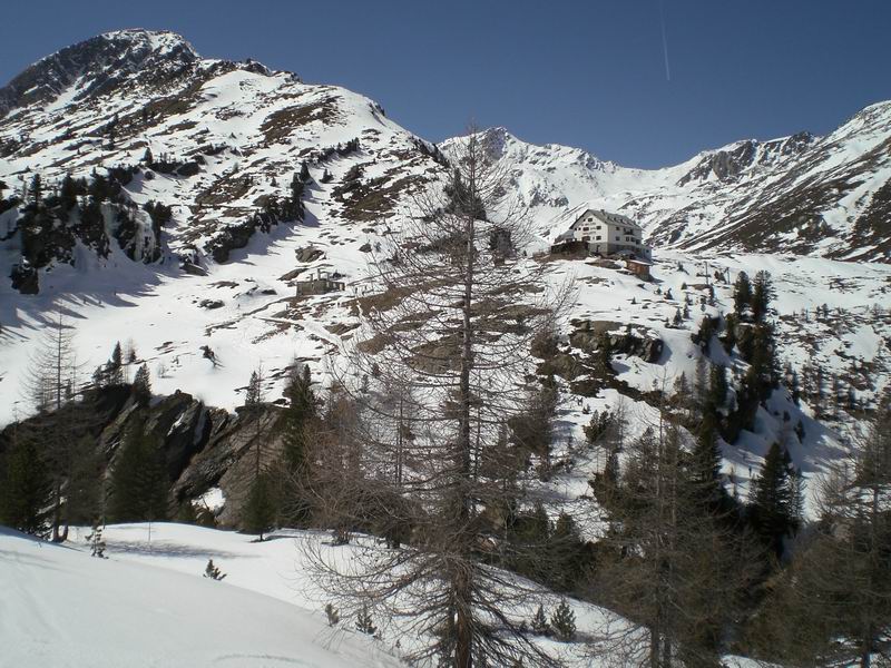 C'è tempo per un ultimo sguardo al superbo Cevedale conquistato il giorno prima. Di fronte abbiamo il rifugio Corsi che pullula di gitanti. Tutti in fila scendono per un'insulsa stradina. Giornata d'oro oggi anche nella scelta dell'itinerario di discesa. Praticamente nessuno davanti e dietro a noi.