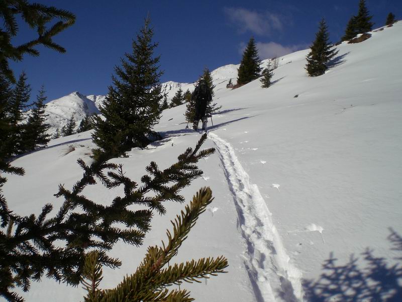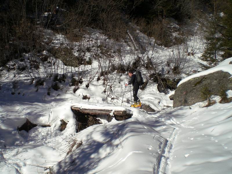 Troppi rami, togliamo gli sci per un breve tratto prima di ricongiungerci alla strada innevata a quota 1.900 circa.