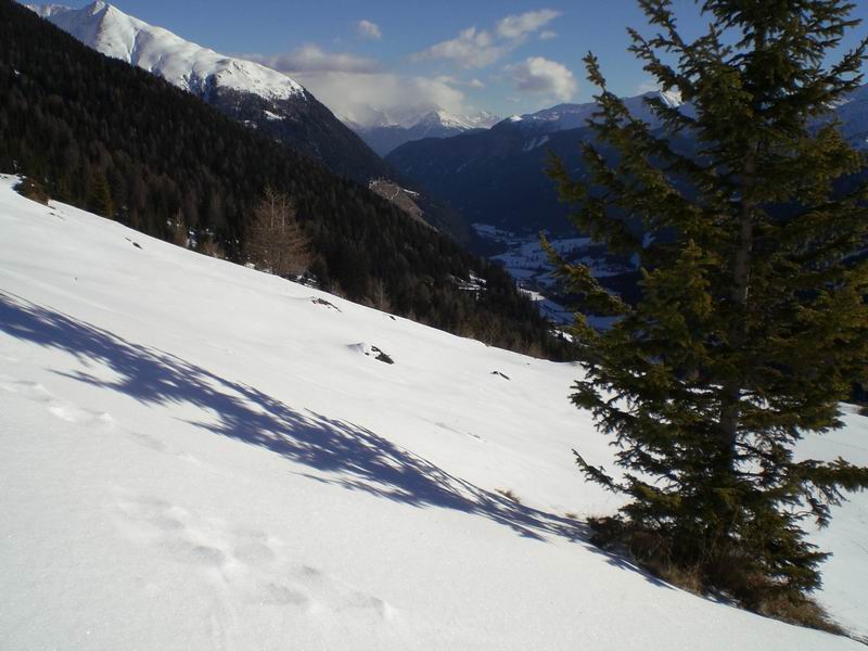 Sci in spalla saliamo lungo la strada fino ad arrivare alla Jagerhof dove possiamo mettere le pelli e salire lungo una stradina innevata. Al primo bivio abbandoniamo la strada per seguire un sentierino nel bosco.