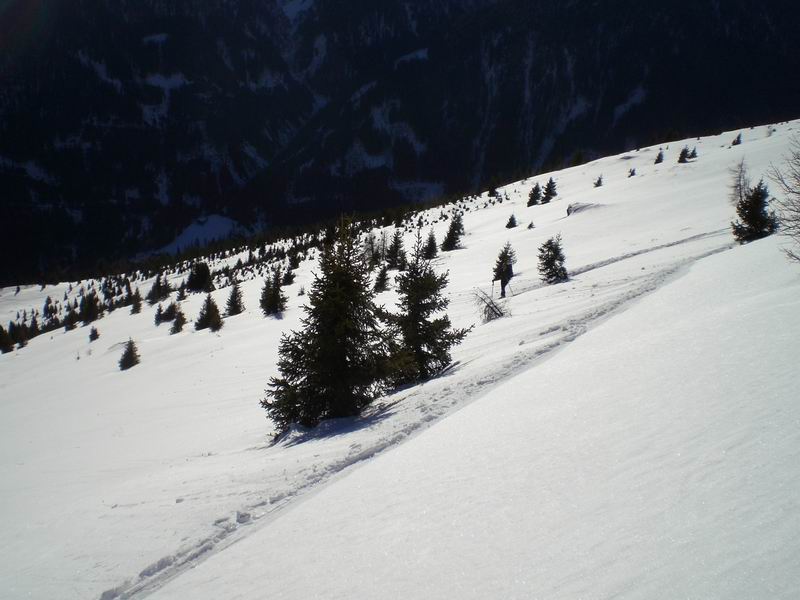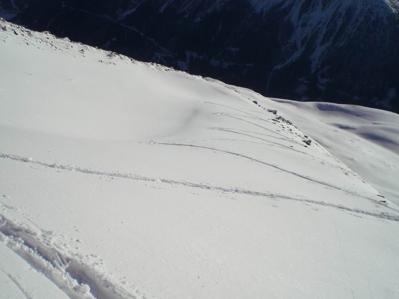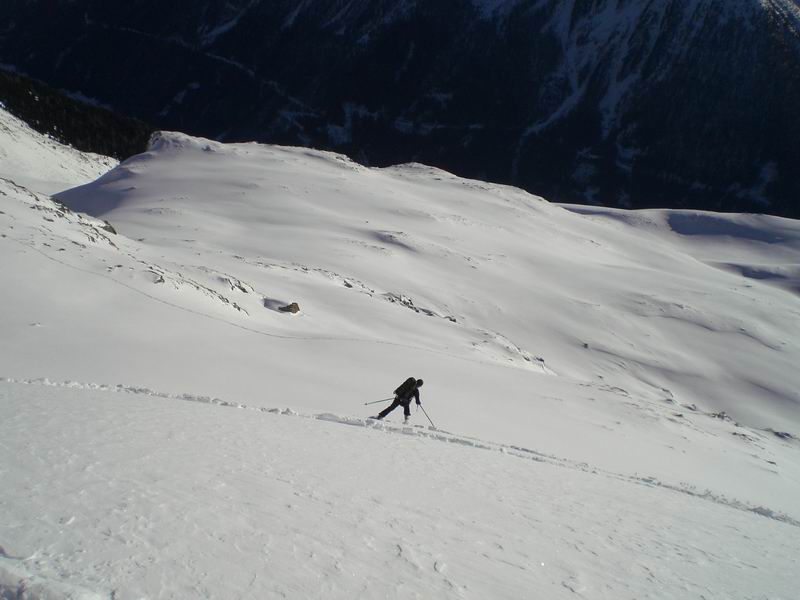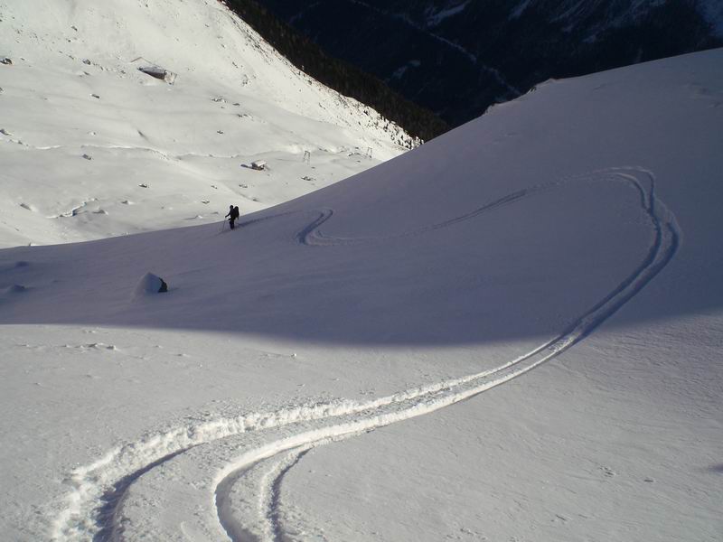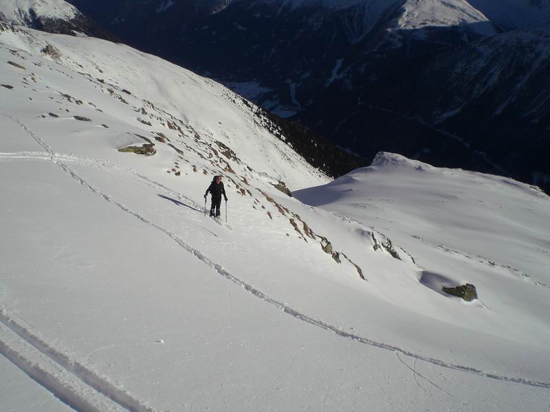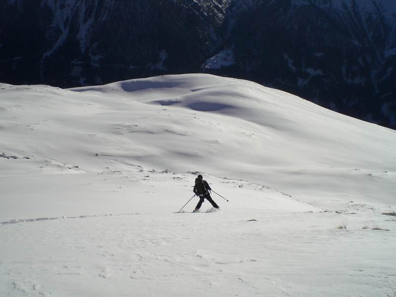 Puntiamo a sud est anzichč ripercorrere la via di salita. Sfruttiamo tutti i canali polverosi divertentissimi fin quasi all'arrivo della teleferica Reggnal (2.261).