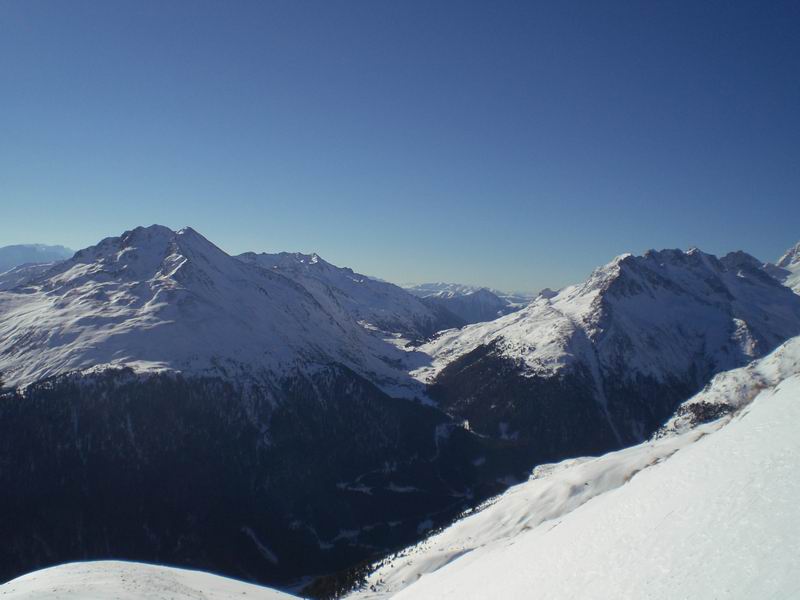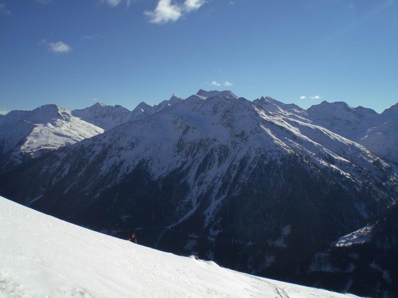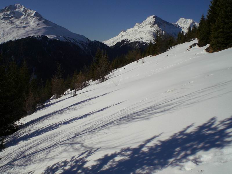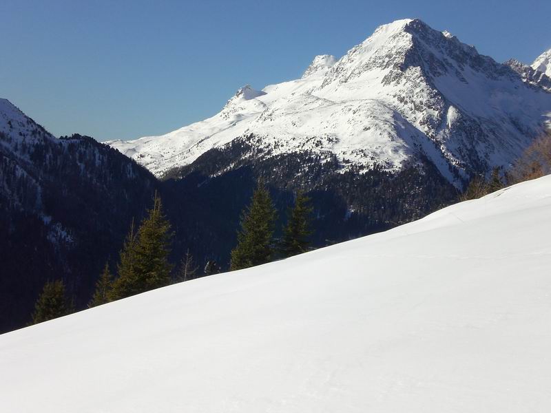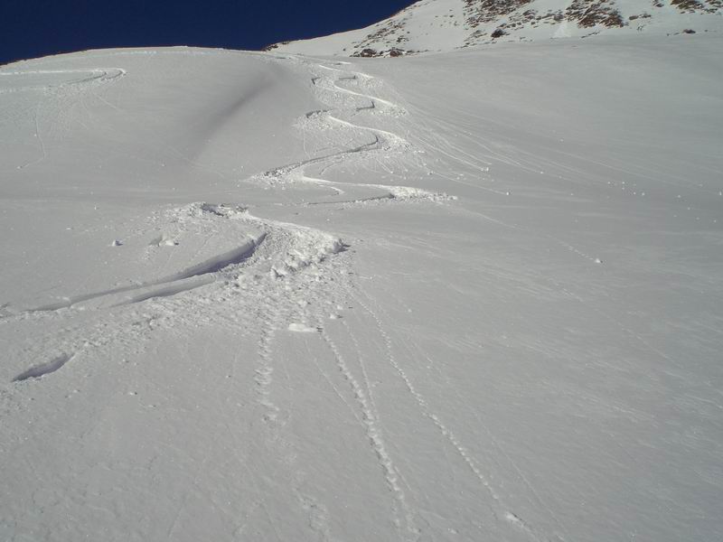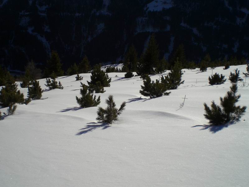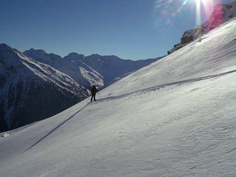 Puntiamo a sud est anzichč ripercorrere la via di salita. Sfruttiamo tutti i canali polverosi divertentissimi fin quasi all'arrivo della teleferica Reggnal (2.261).