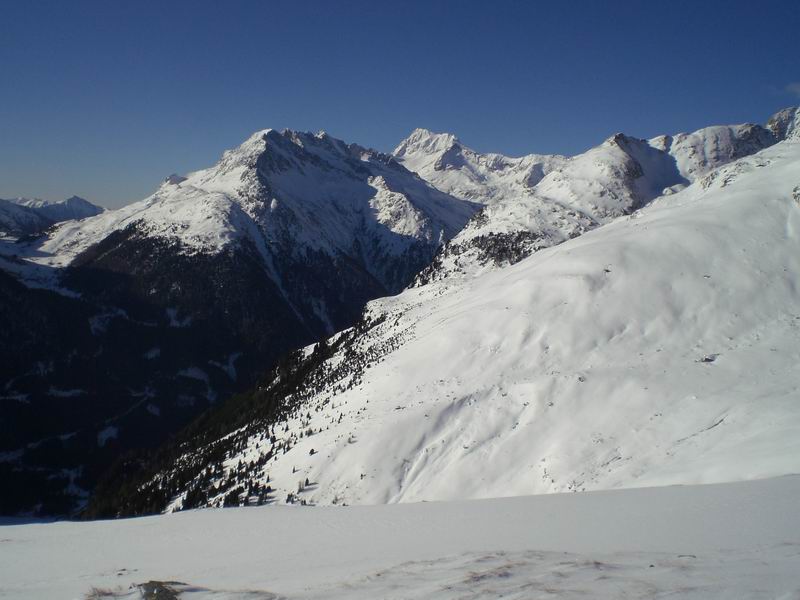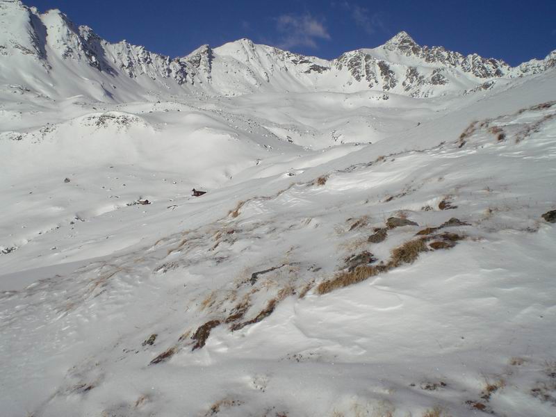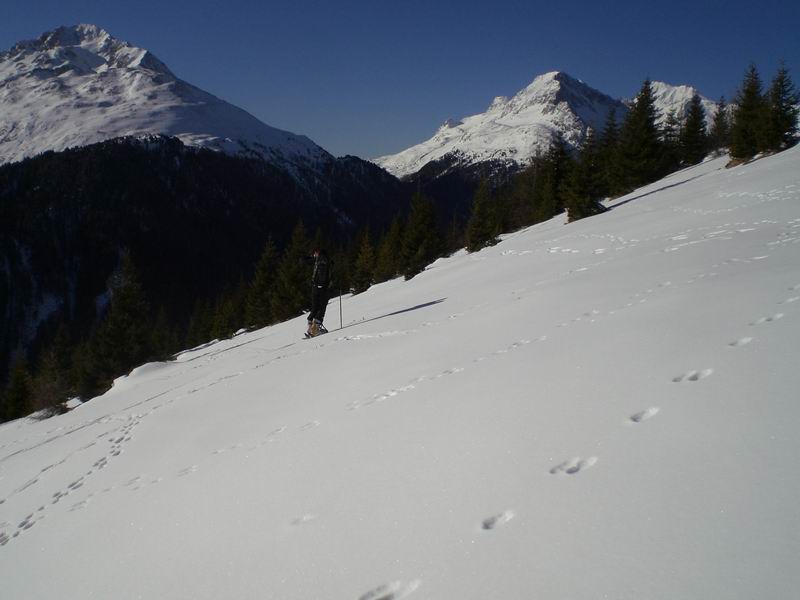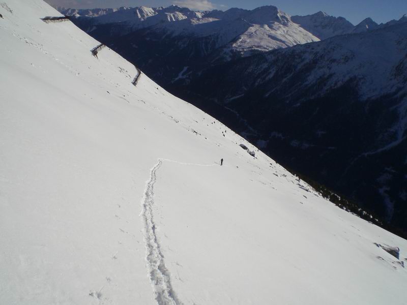 Pił o meno in traverso verso ovest, sotto le barriere paravalanghe aggiriamo lo spallone dell'oberberg per arrivare sopra in vista della Seespitzhuette (2.371).