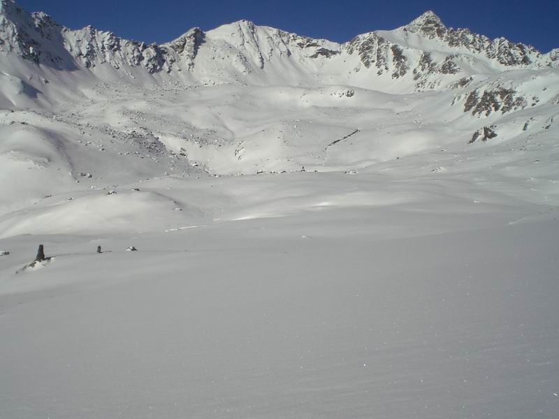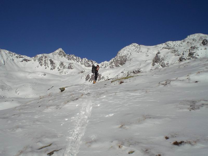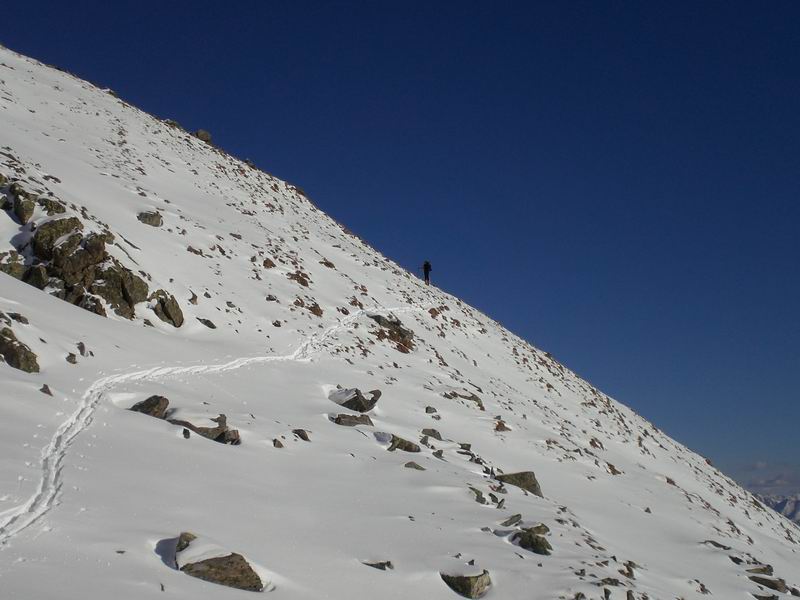 Un tratto sassoso ci porta nel vallone d'accumulo sud est. Risaliamo fin dove possibile con brevi zig zag.