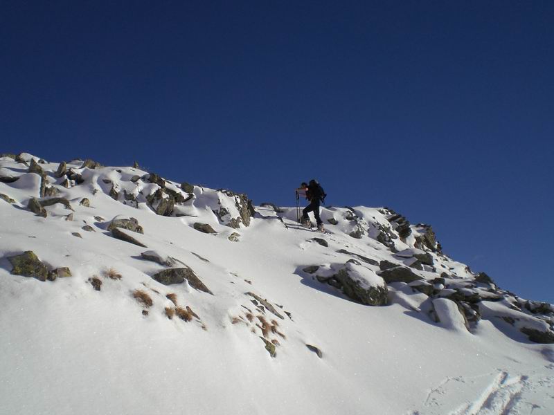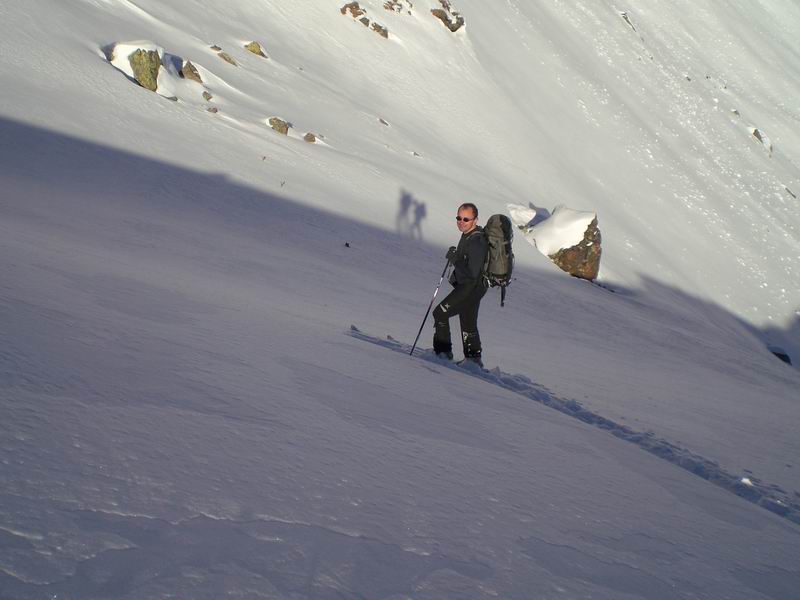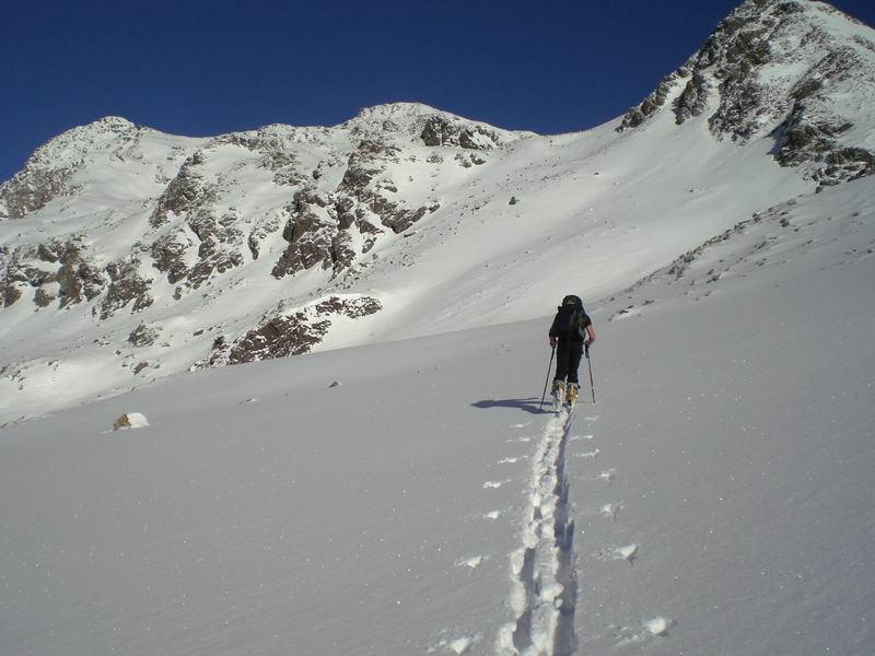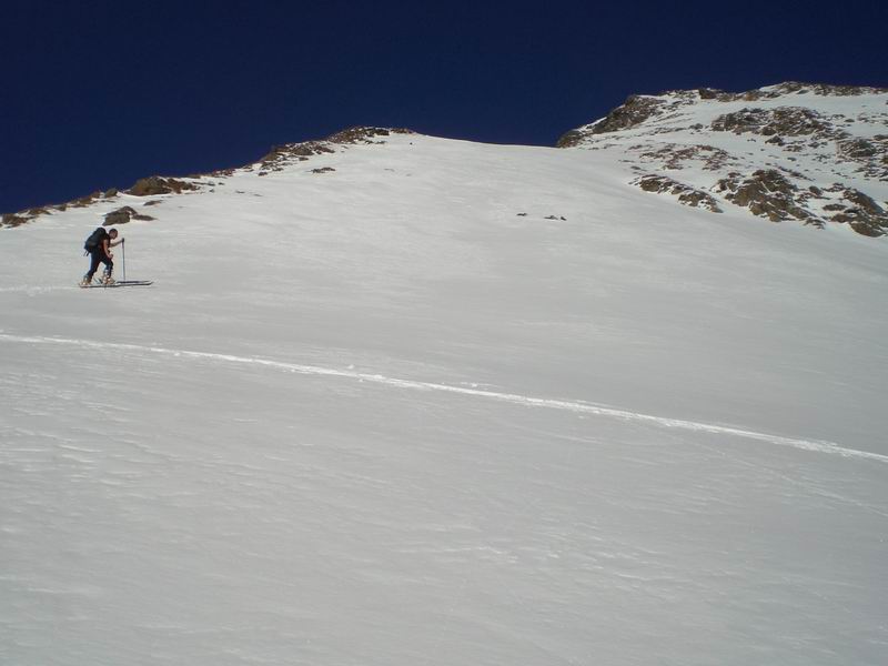 Circa a quota 2.600 la neve polverosa accumulata ci fa desistere. Togliamo le pelli e via nella splendida discesa in neve zuccherina.