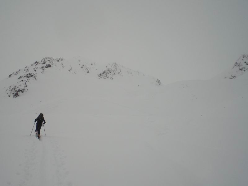 Prima parte della discesa quasi alla cieca nel bianco. Teniamo più o meno la traccia di salita. Poi si apre e finalmente si riesce a vedere qualcosa.