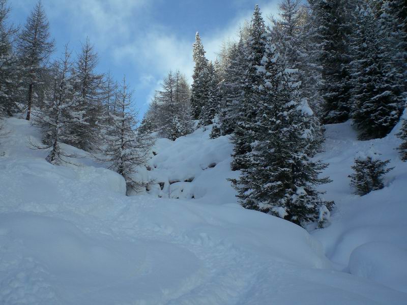 Risaliamo tutta la pista a bordo skilift. Quindi, con un ripido boschetto recuperiamo la stradina che seguiamo fino al rio. Attraversiamo il bach e in salita nel bosco usciamo negli ampi valloni.