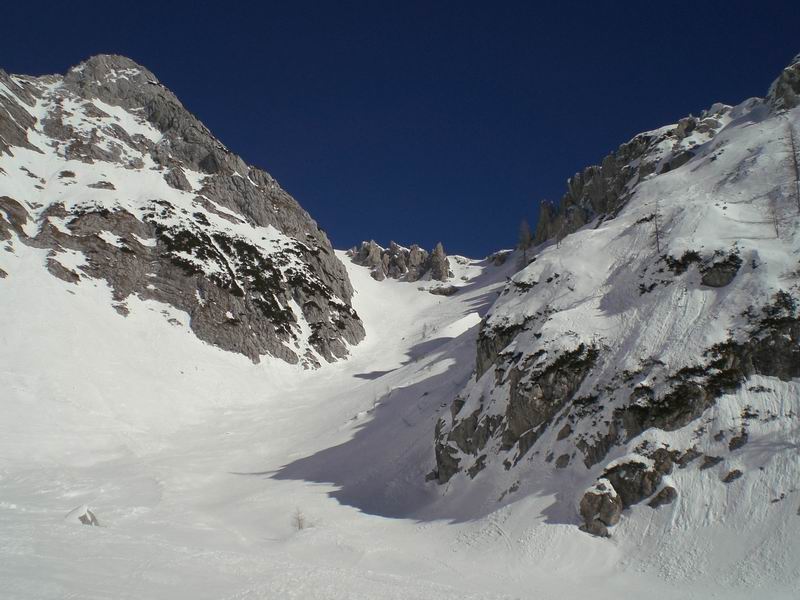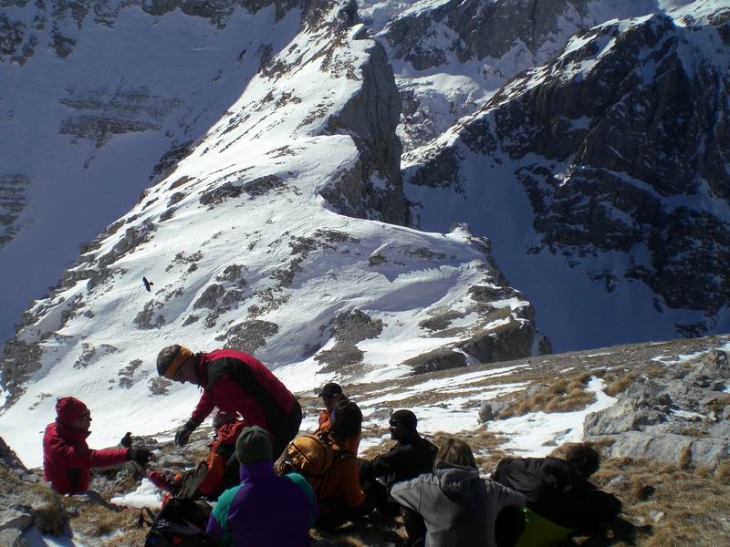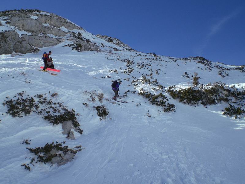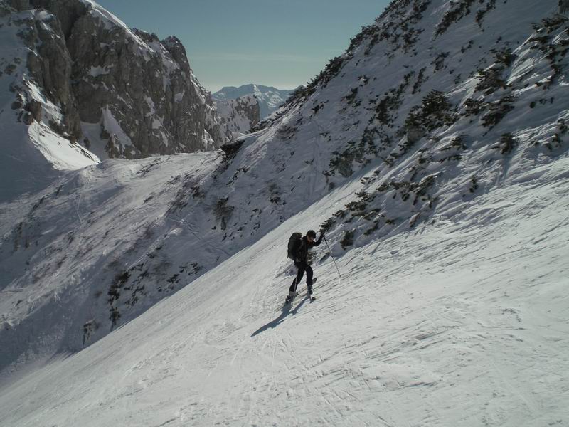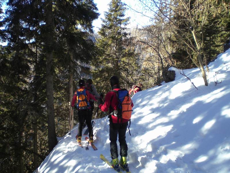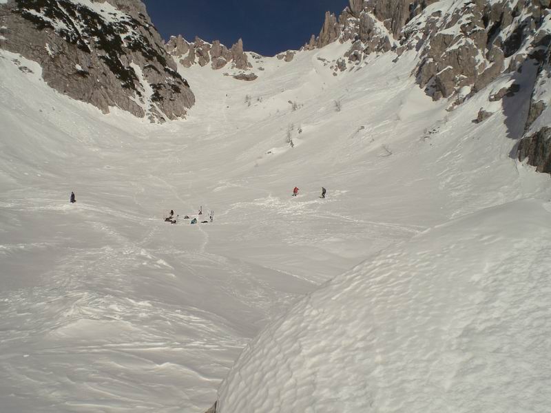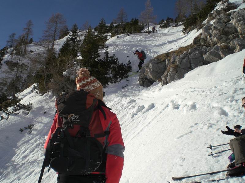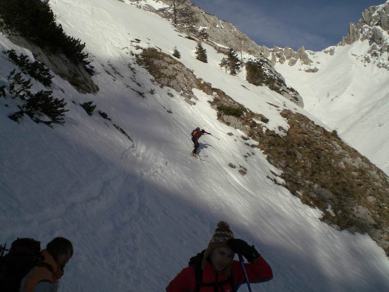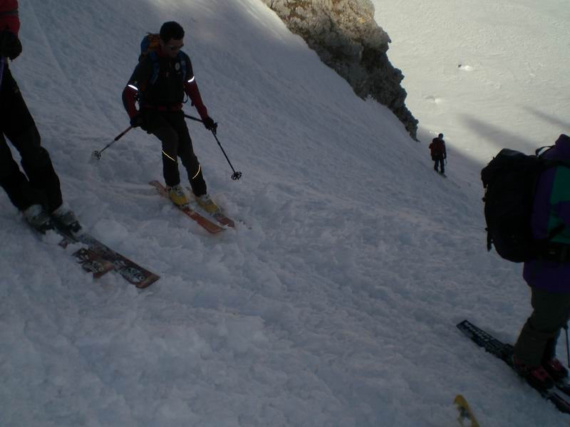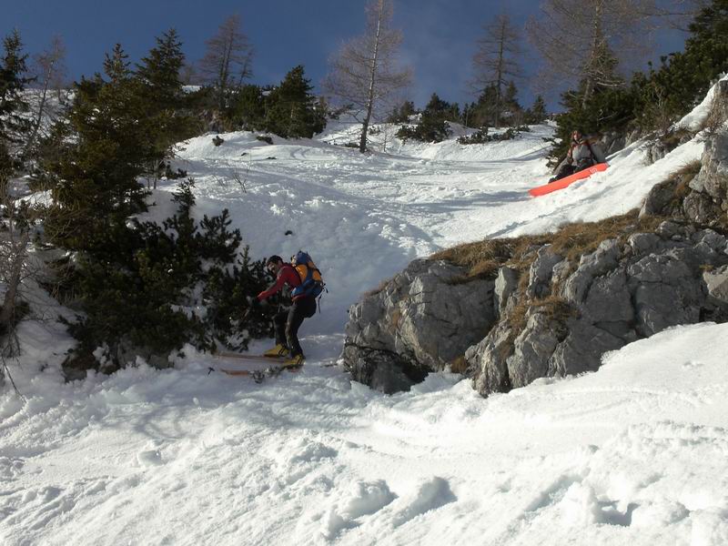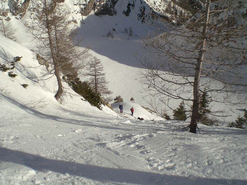 Per tornare al pianoro Jezerce imbocchiamo un simpatico canale ripido con tanto di strettoia. Roccia a sinistra, rami a destra, gli sci non passano. Anzi, le punte si incagliano nei rami e si rischia il volo. Tutti passano indenni.