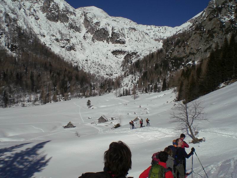 A quota 1.550 circa si scavalca lo spallone boschivo staccando gli sci per porcedere a piedi su un tratto stretto del sentierino. Quindi si scende in radura (crosta) fino alle casette pl. Konjscica (1.438).