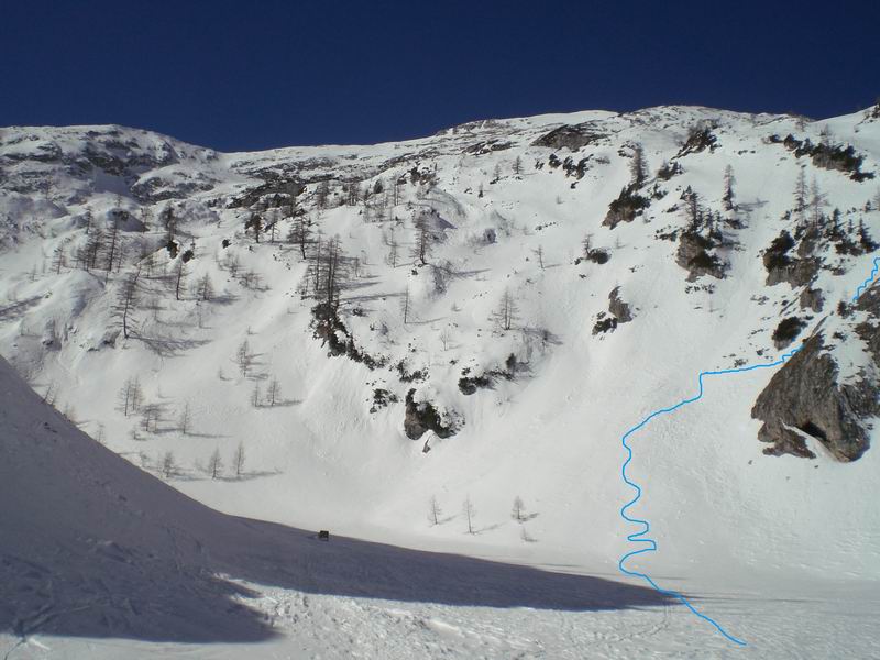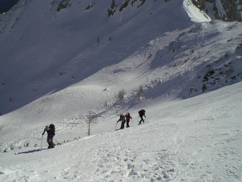 Subito sotto affiorano delle rocce che rendono difficoltosa la sciata. Ne sa qualcosa Uolter che si fa 20m di scivolata a testa in giù nel canale.