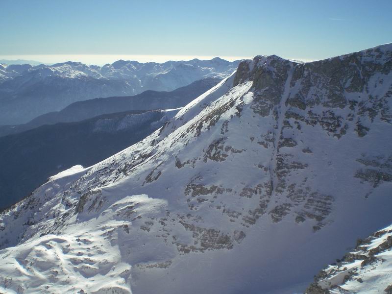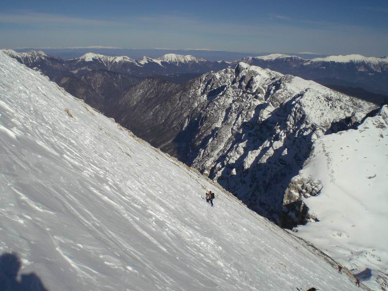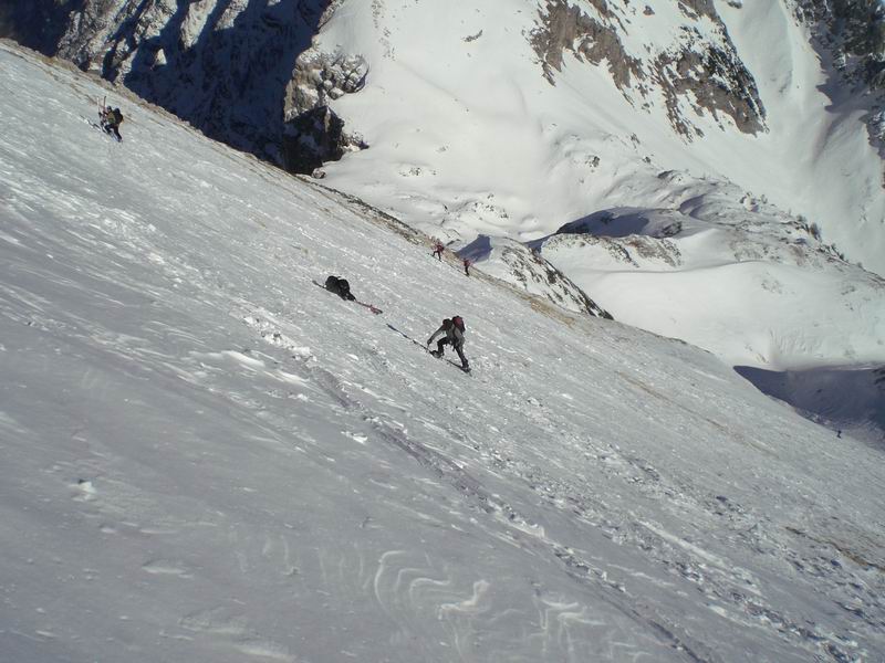 Divertente discesa dalla cima su bella pendenza. Anzichè tornare per la via di salita verso sud continuiamo a nord est nella Na kontah. Andrej spacca l'attacco e per proseguire è costretto a nastrare attacco e scarpone in un tutt'uno e a scendere picozza in mano.