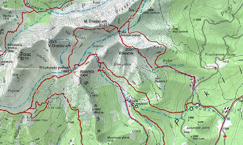 Da qui si risale la vallonata del Klanci per arrivare all'ampio pianoro Jezerce. Si gira verso sud ovest in direzione della sella studorski preval per poi piegare a nord ed infine, risalire il pendio (circa 30°) esposto ad est fino alla cima del Veliki Draski vrh (2.243).