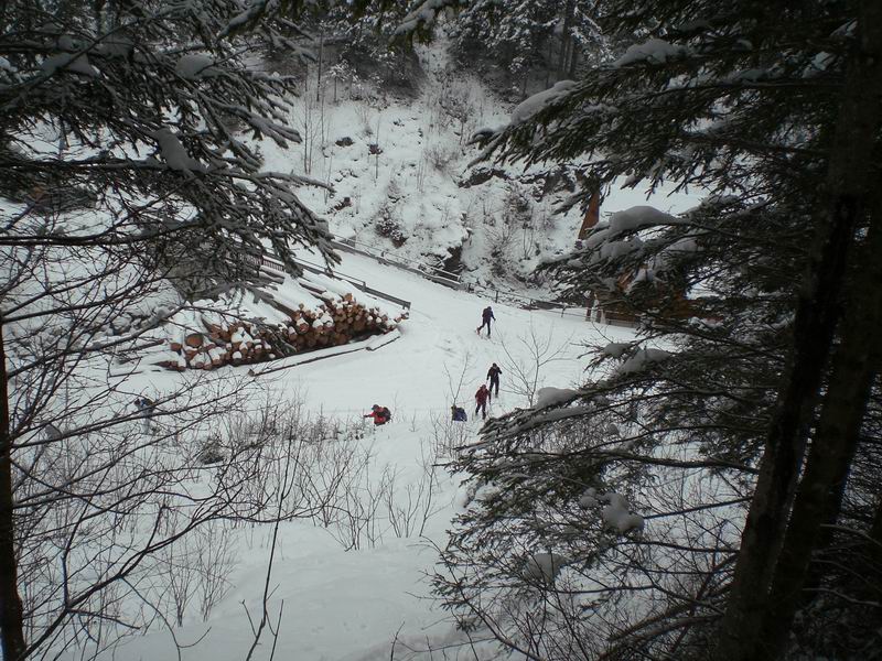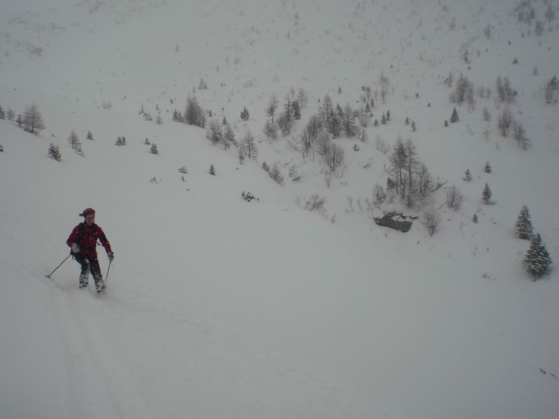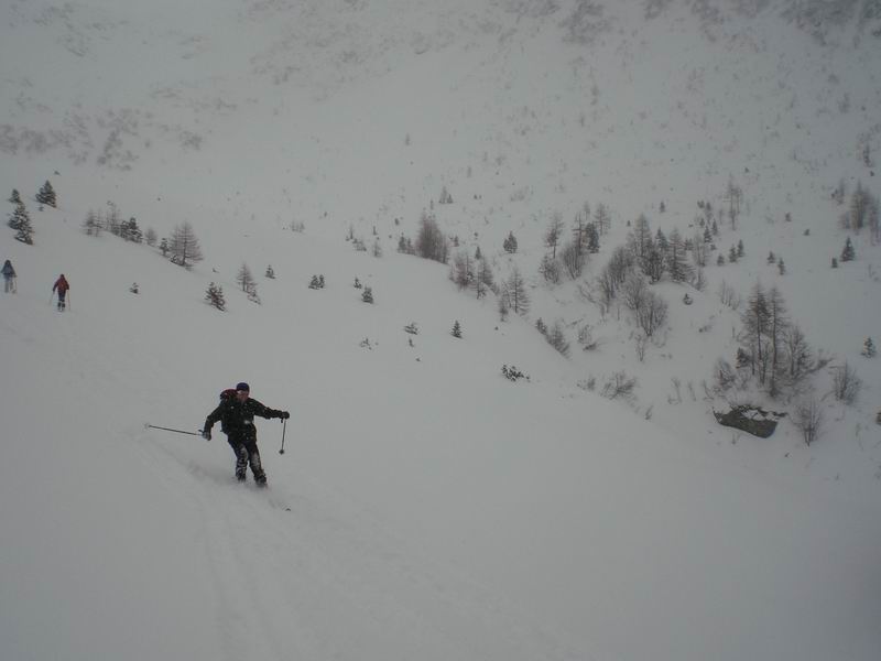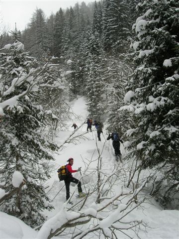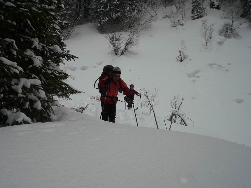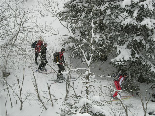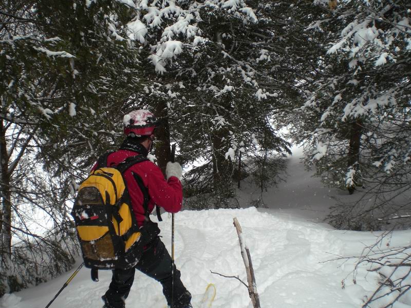 Ripiombati nel boschetto scendiamo lungo la via di salita in fantastica neve farinosa. Veramente uno spasso.