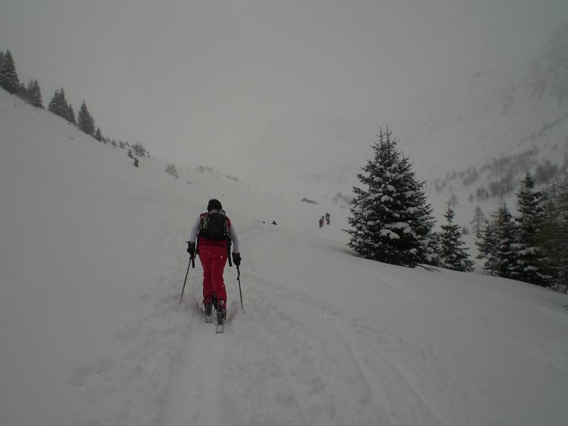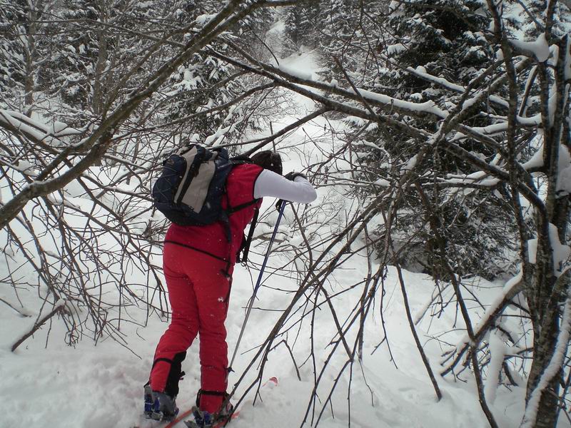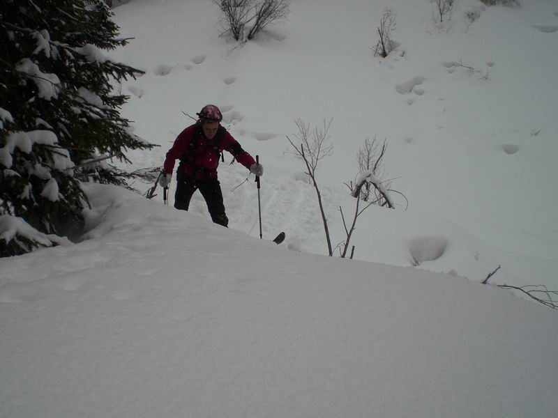 Il bastoncino va sotto per 70cm di neve fresca. Continua a nevicare, l'ultimo pezzo della forcelletta è più ripido e sopra ci sono evidenti cornici.