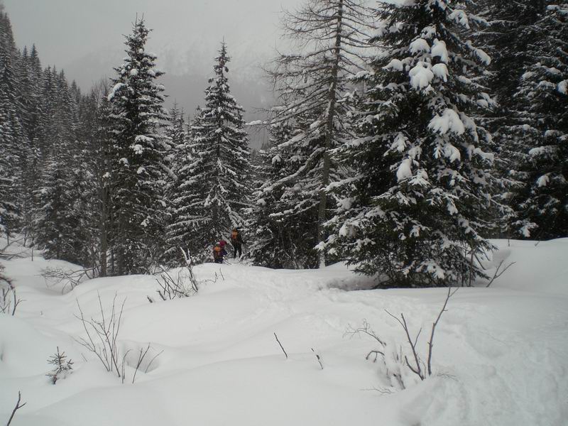 In 40 cm di polvere seguiamo il corso del rio (destra orografica) fino a riprendere la strada forestale e raggiungere la casera Plumbs (1.779).