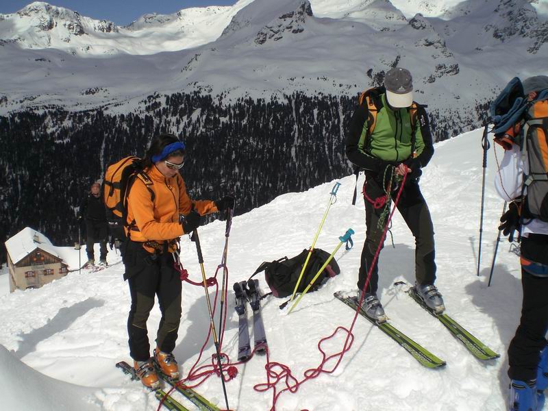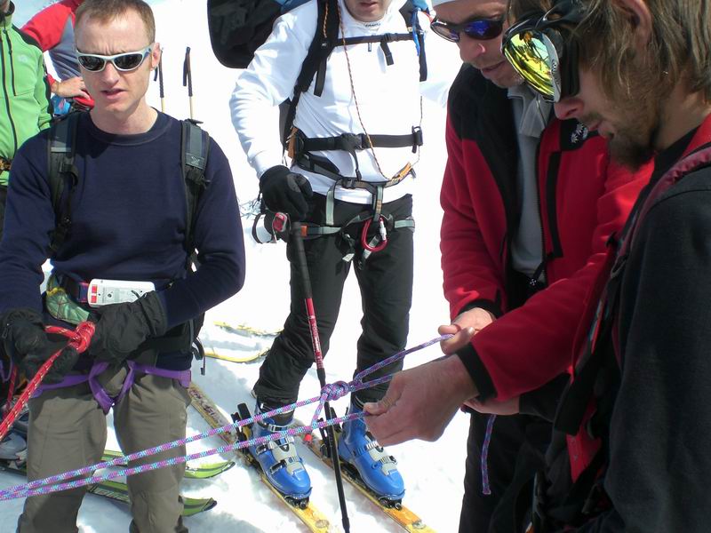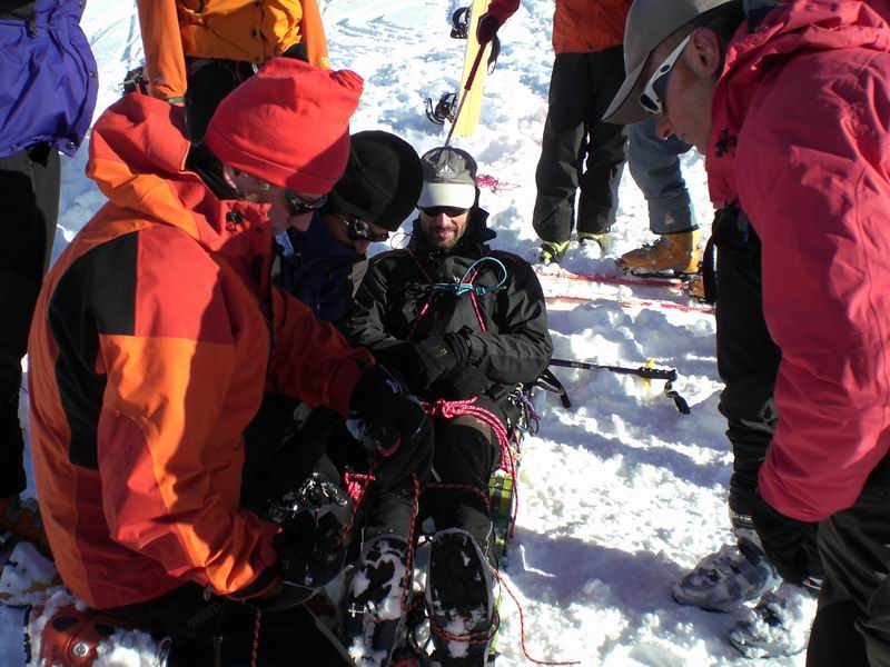 Simuliamo una progressione in cordata su ghiacciaio. A 3 ci leghiamo sull' imbraco e proviamo alcuni pendoli in