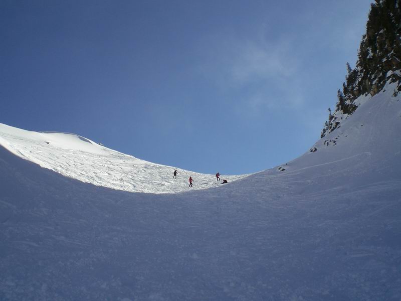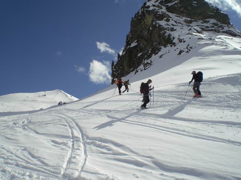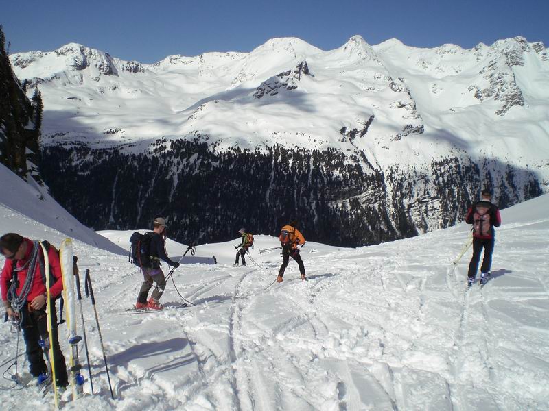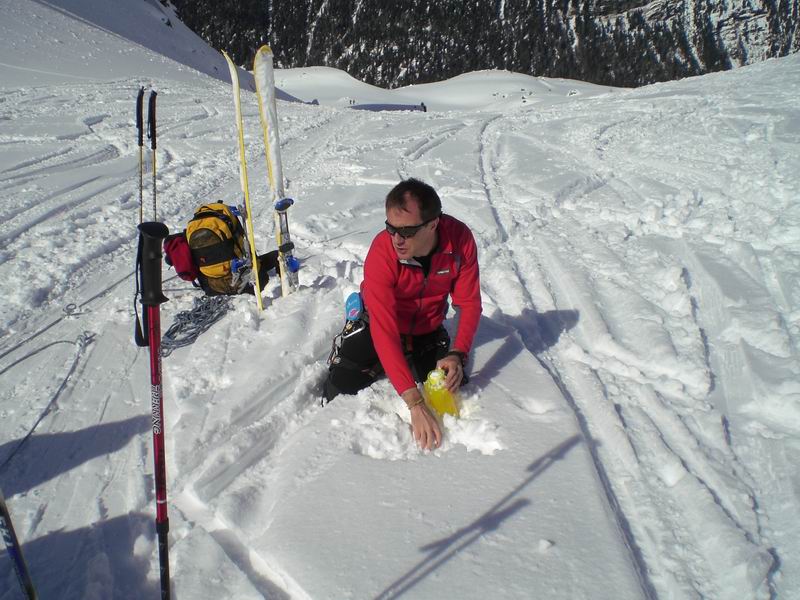 Poco più sotto scatta una simulazione di autosoccorso in valanga. 4 travolti di cui uno senza arva.