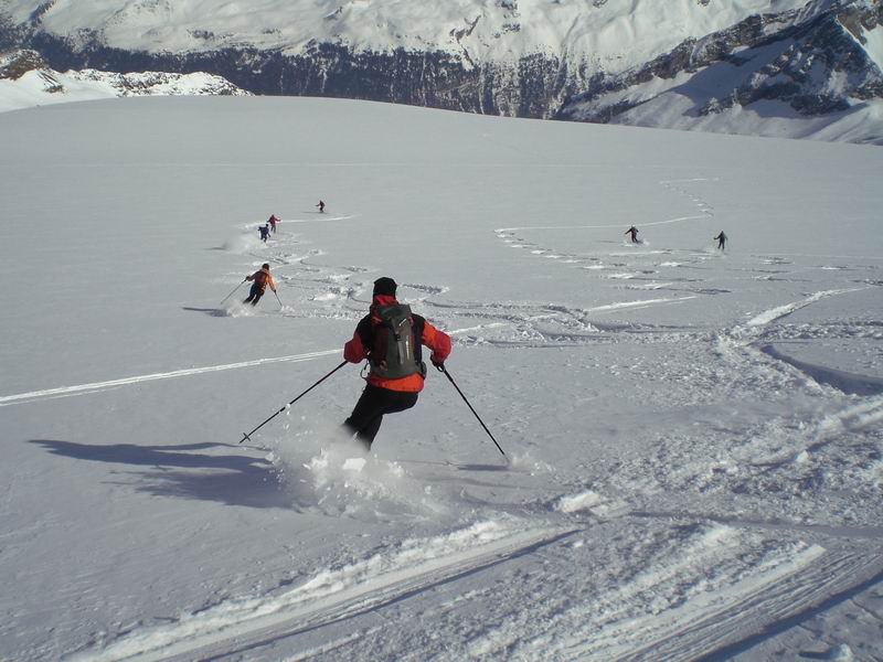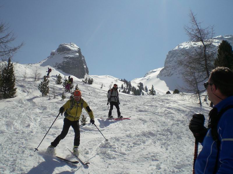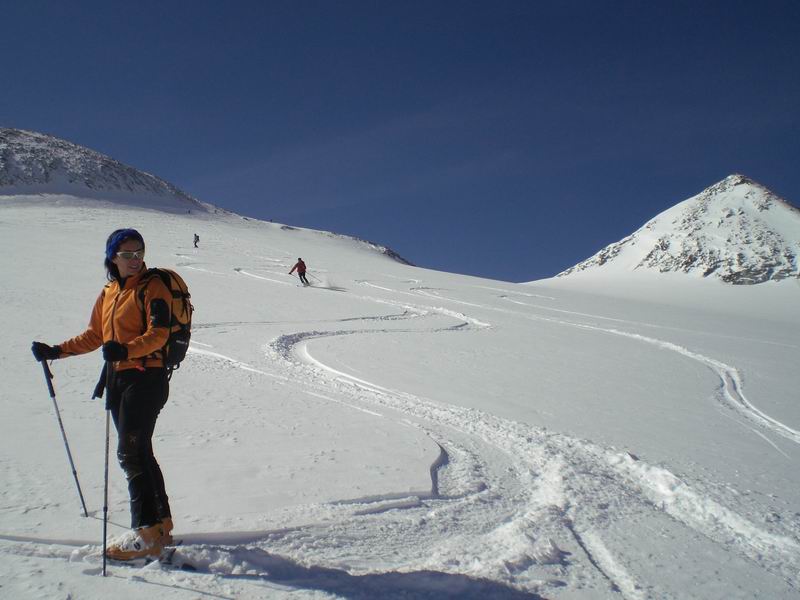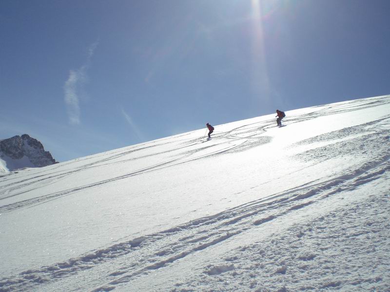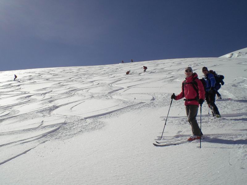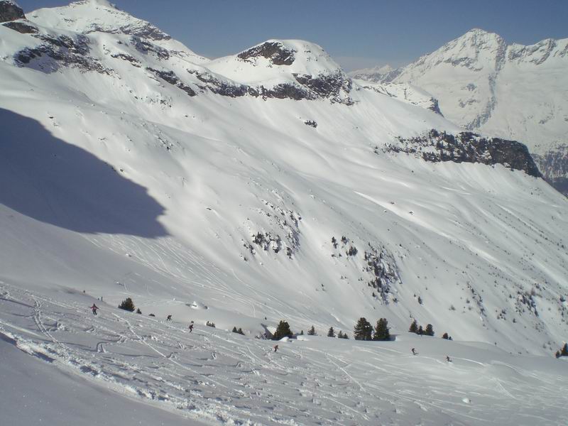 Discesa fenomenale. Dalla cima fino al Tristennockl sono 800m in polvere con ampie zone ancora intonse. Spazi larghi, pendenza ottimale e curve