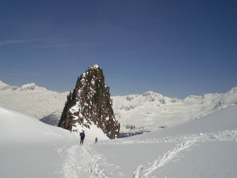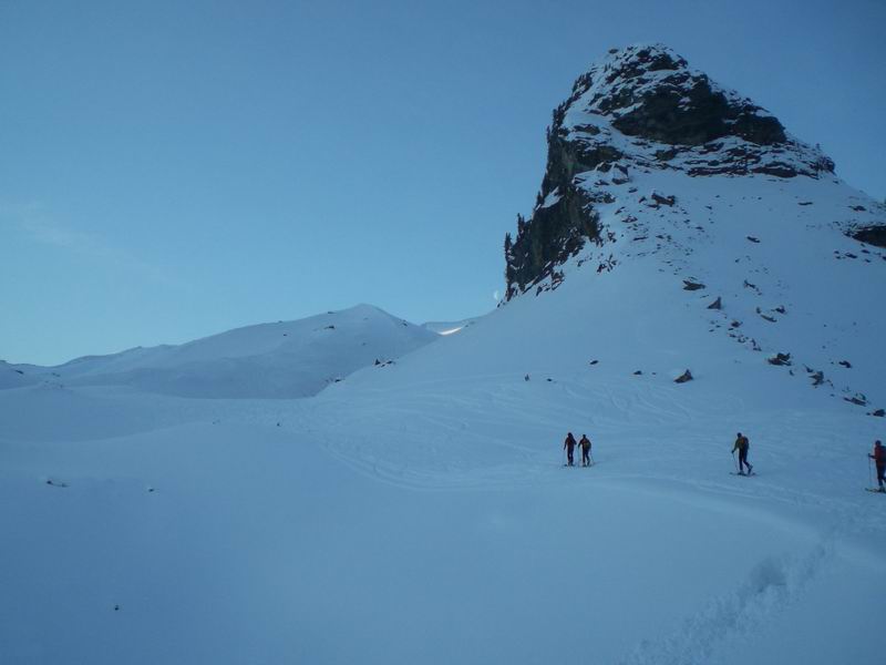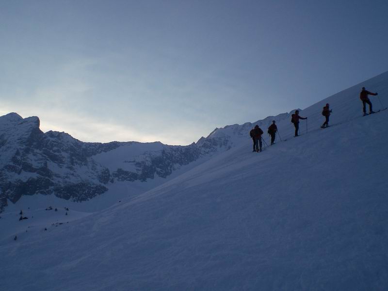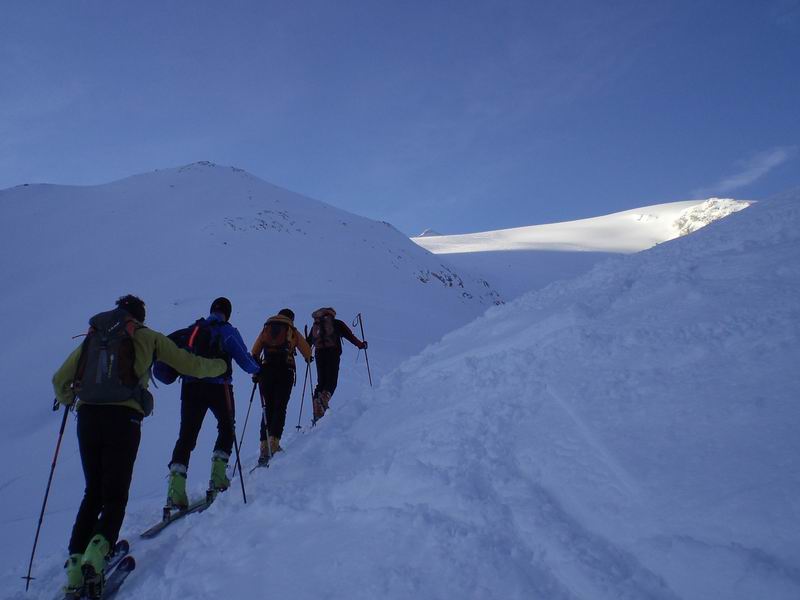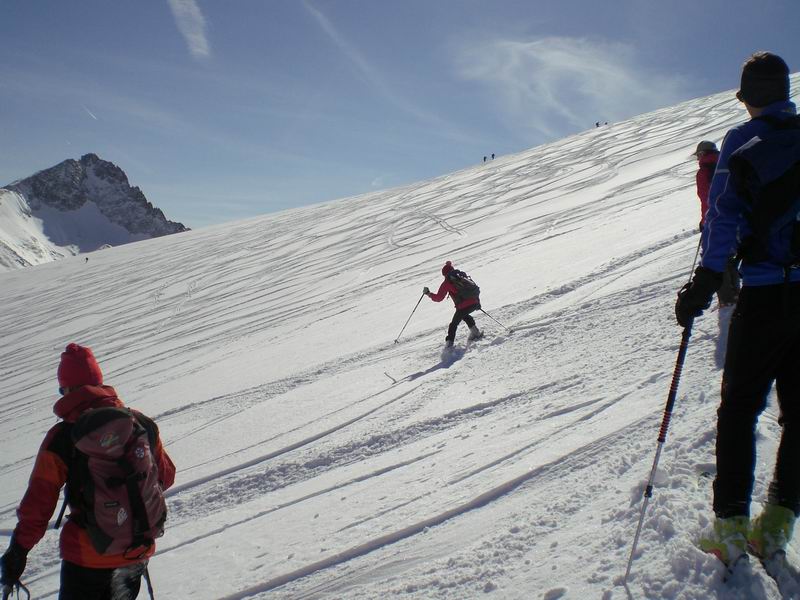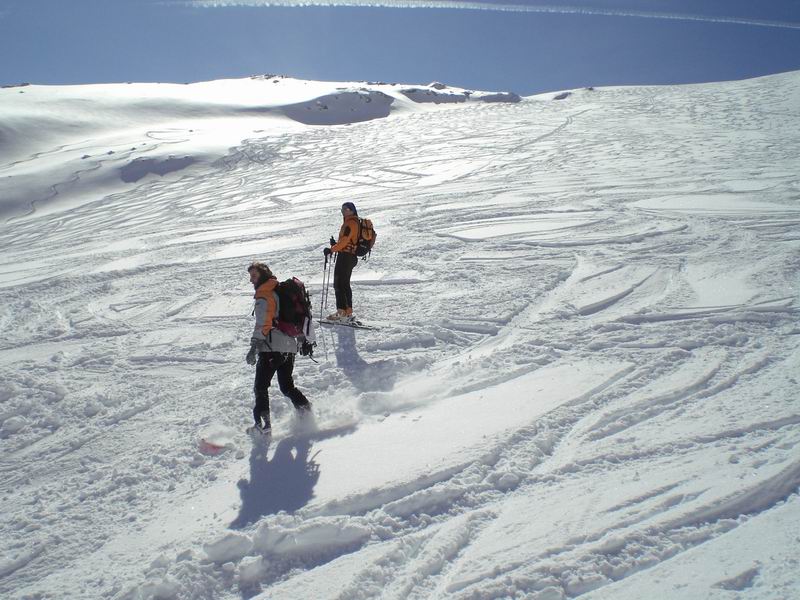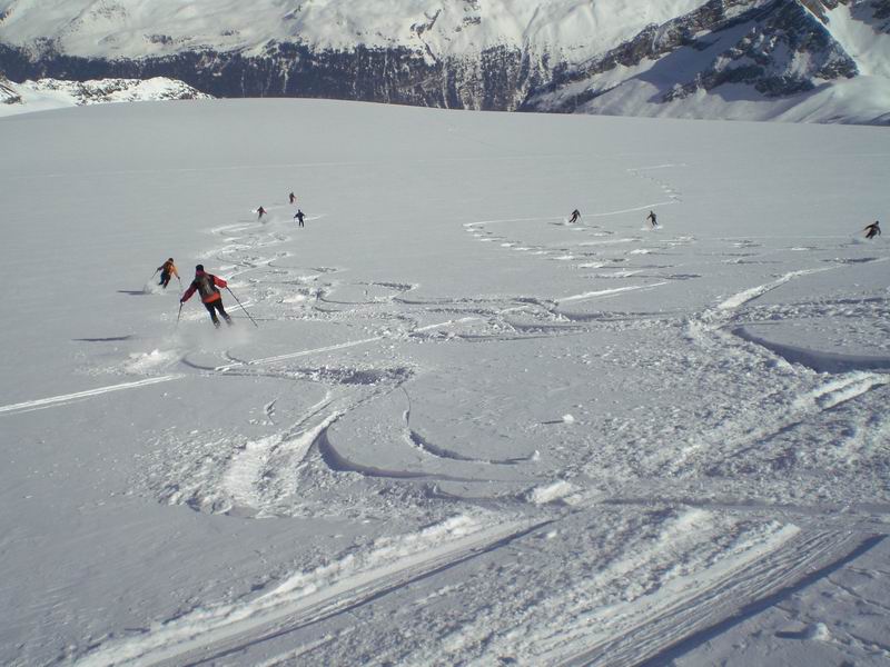 Discesa fenomenale. Dalla cima fino al Tristennockl sono 800m in polvere con ampie zone ancora intonse. Spazi larghi, pendenza ottimale e curve